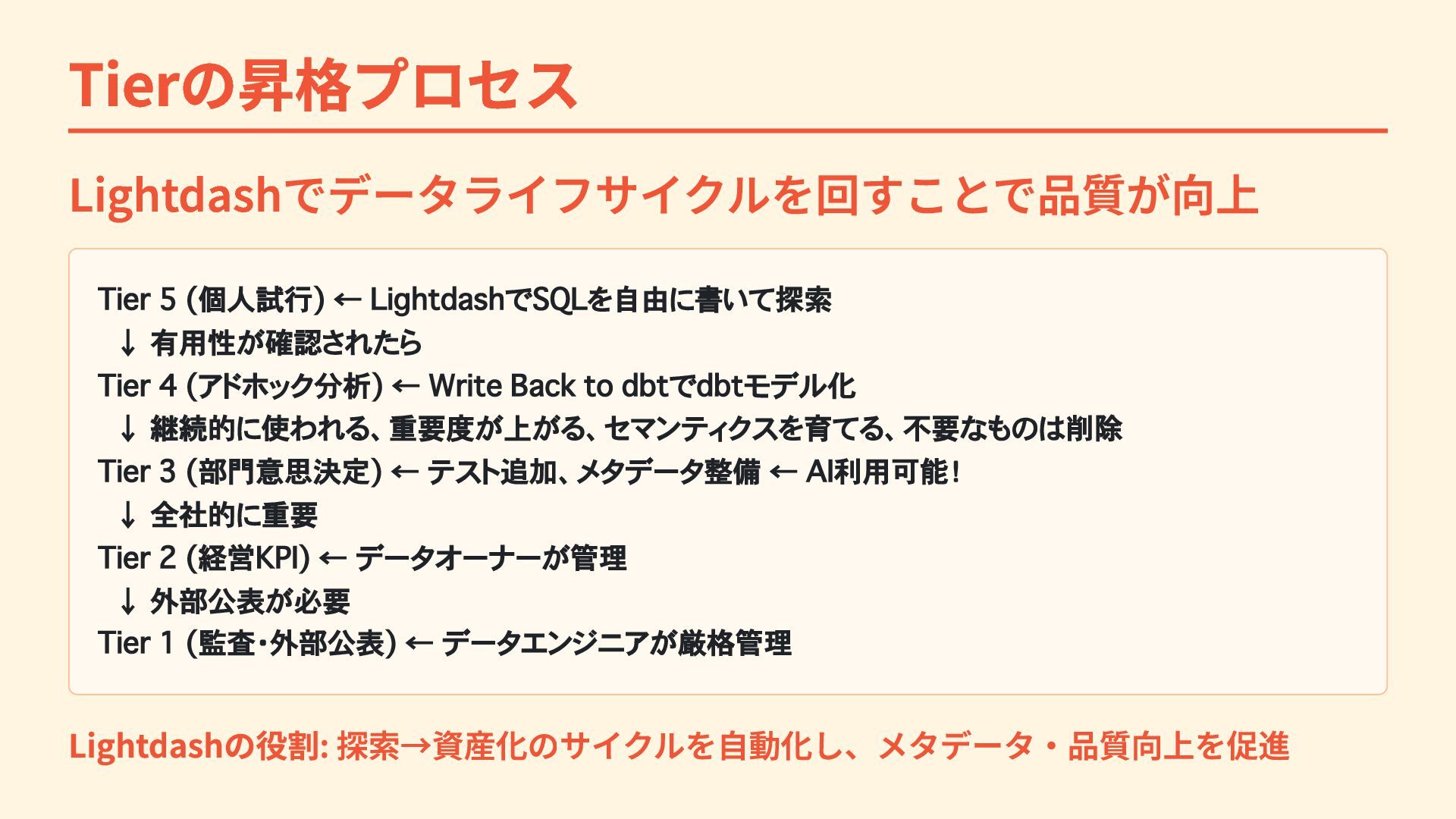 4 (アドホック分析) ← Write Back to dbtでdbtモデル化 ↓ 継続的に使われる、重要度が上がる、セマンティクスを育てる、不要なものは削除 Tier 3 (部門意思決定) ← テスト追加、メタデータ整備 ← AI利用可能! ↓ 全社的に重要 Tier 2 (経営KPI) ← データオーナーが管理 ↓ 外部公表が必要 Tier 1 (監査・外部公表) ← データエンジニアが厳格管理 Lightdashの役割: 探索→資産化のサイクルを自動化し、メタデータ・品質向上を促進
