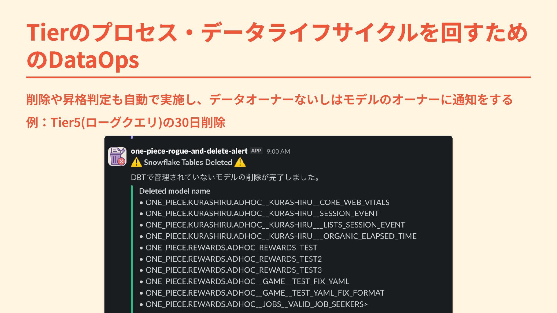 Tierのプロセス・データライフサイクルを回すため のDataOps 削除や昇格判定も自動で実施し、データオーナーないしはモデルのオーナーに通知をする 例:Tier5(ローグクエリ)の30日削除
