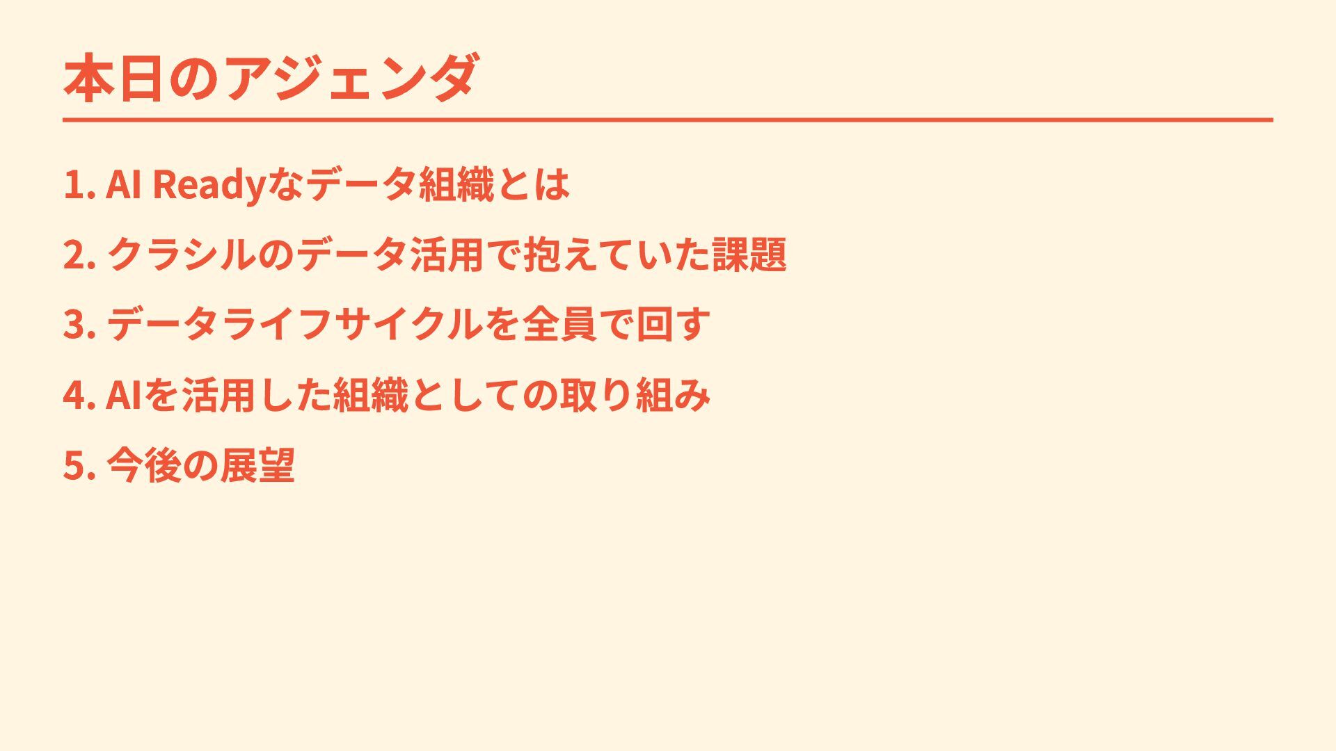 本日のアジェンダ 1. AI Readyなデータ組織とは 2. クラシルのデータ活用で抱えていた課題 3. データライフサイクルを全員で回す 4. AIを活用した組織としての取り組み