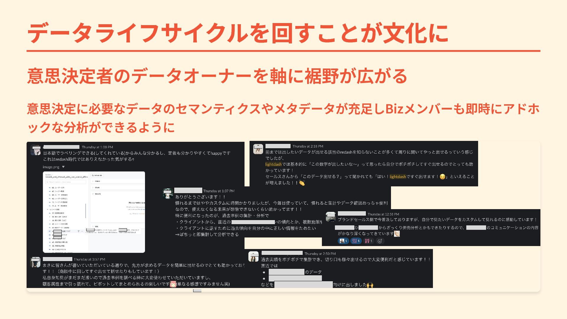 データライフサイクルを回すことが文化に 意思決定者のデータオーナーを軸に裾野が広がる 意思決定に必要なデータのセマンティクスやメタデータが充足しBizメンバーも即時にアドホ ックな分析ができるように