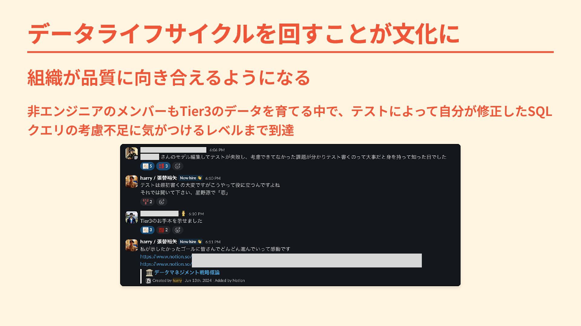 データライフサイクルを回すことが文化に 組織が品質に向き合えるようになる 非エンジニアのメンバーもTier3のデータを育てる中で、テストによって自分が修正したSQL クエリの考慮不足に気がつけるレベルまで到達
