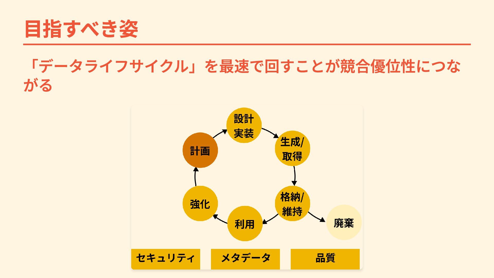 目指すべき姿 データ管理の観点では「データライフサイクル」を最速で回すこ とが競合優位性につながる