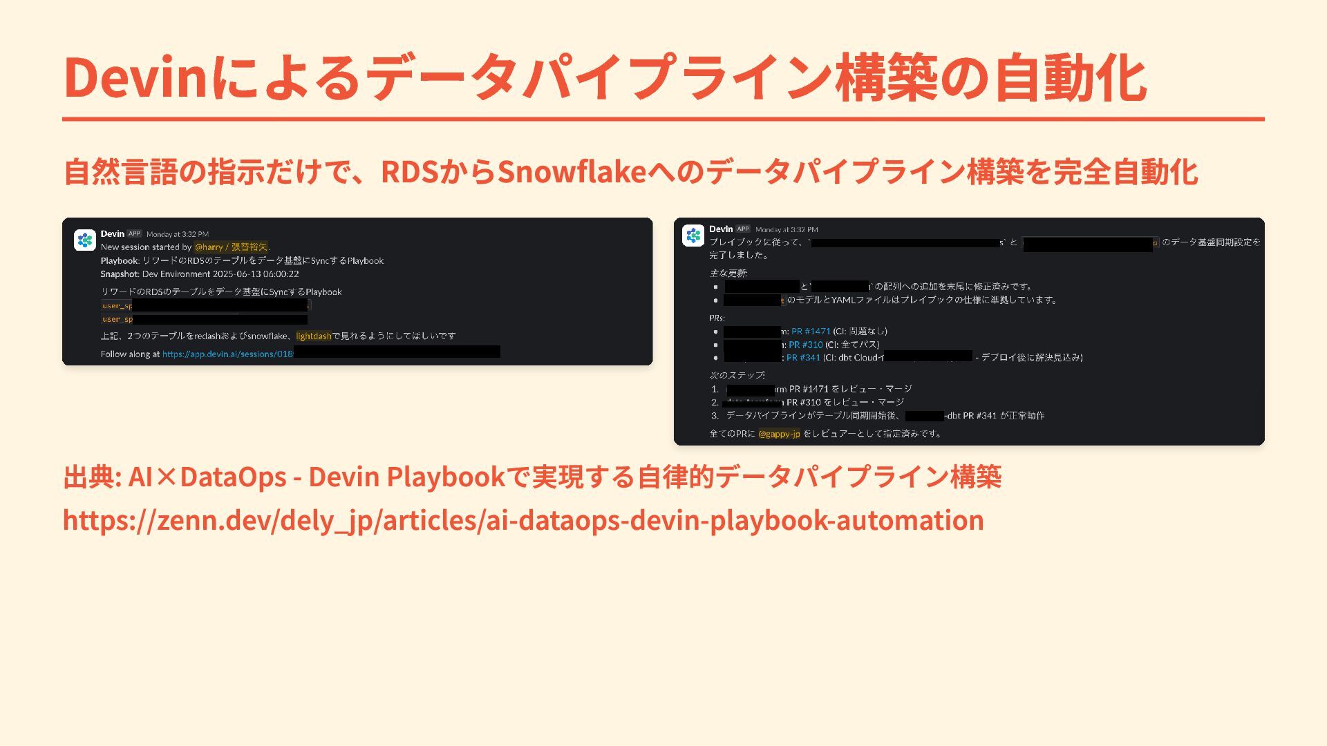 Devinによるデータパイプライン構築の自動化 自然言語の指示だけで、RDSからSnowflakeへのデータパイプライン構築を完全自動化 出典: AI×DataOps - Devin Playbookで実現する自律的データパイプライン構築 https://zenn.dev/dely_jp/articles/ai-dataops-devin-playbook-automation