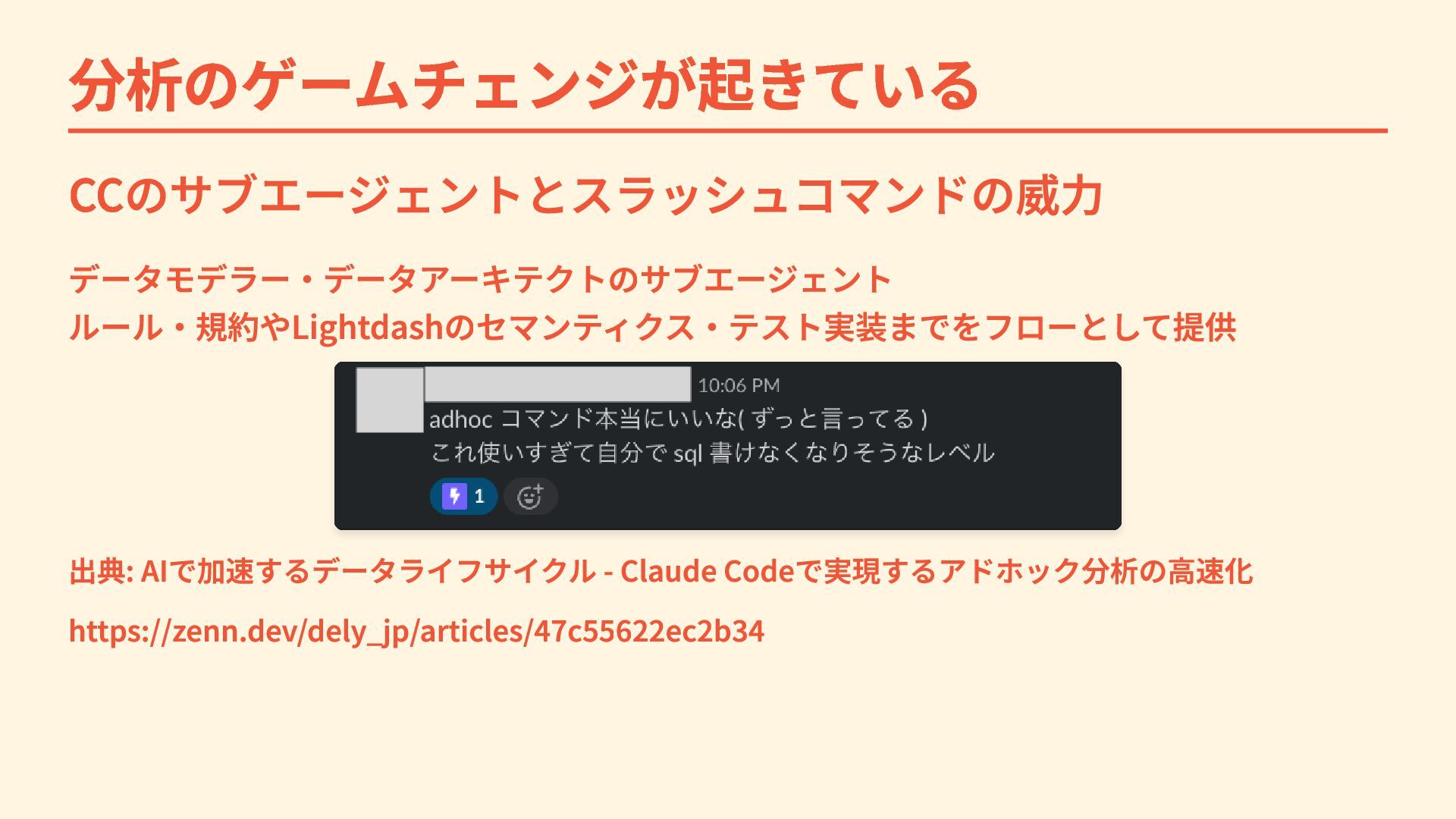分析のゲームチェンジが起きている CCのサブエージェントとスラッシュコマンドの威力 データモデラー・データアーキテクトのサブエージェント ルール・規約やLightdashのセマンティクス・テスト実装までをフローとして提供 出典: AIで加速するデータライフサイクル - Claude Codeで実現するアドホック分析の高速化 https://zenn.dev/dely_jp/articles/47c55622ec2b34