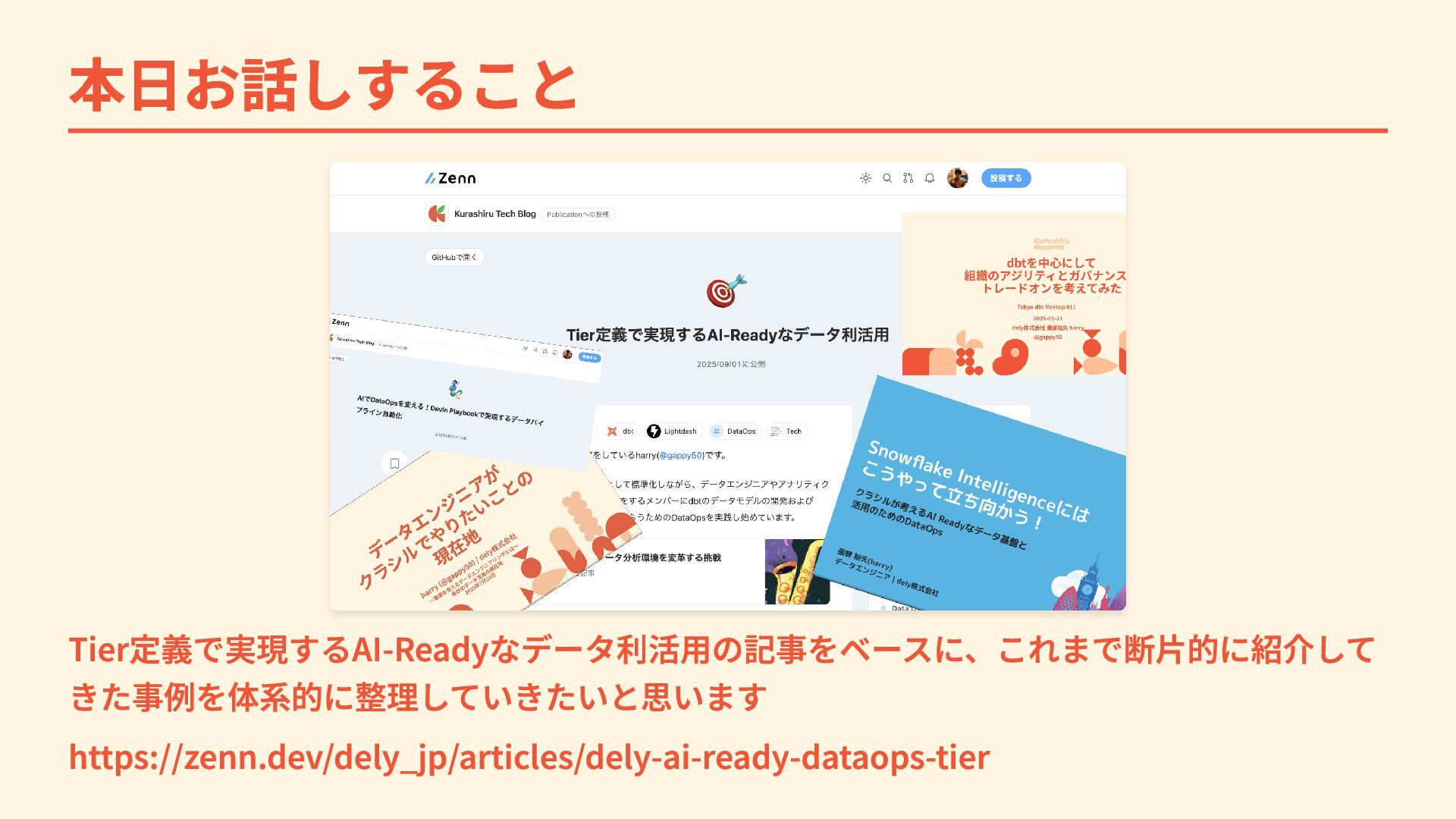 本日お話しすること Tier定義で実現するAI-Readyなデータ利活用の記事をベースに、これまで断片的に紹介して きた事例を体系的に整理していきたいと思います https://zenn.dev/dely_jp/articles/dely-ai-ready-dataops-tier
