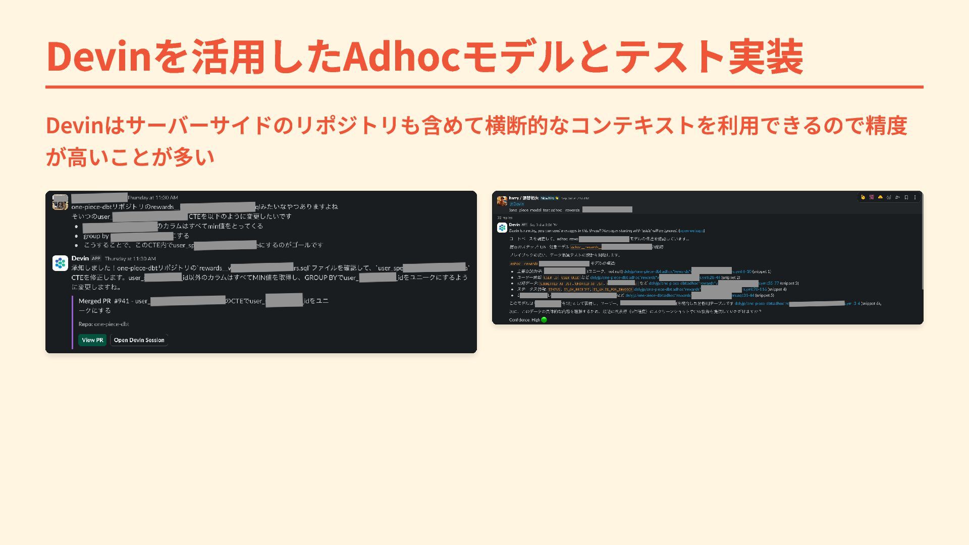 Devinを活用したAdhocモデルとテスト実装 Devinはサーバーサイドのリポジトリも含めて横断的なコンテキストを利用できるので精度 が高いことが多い
