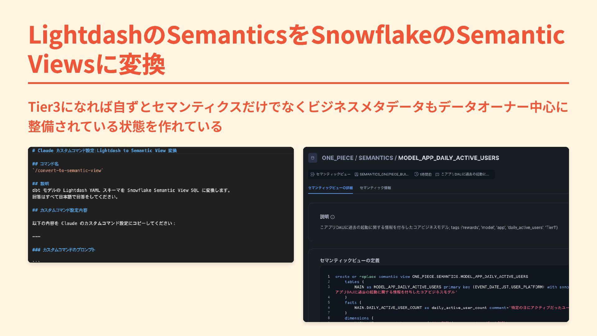 LightdashのSemanticsをSnowflakeのSemantic Viewsに変換 Tier3になれば自ずとセマンティクスだけでなくビジネスメタデータもデータオーナー中心に 整備されている状態を作れている