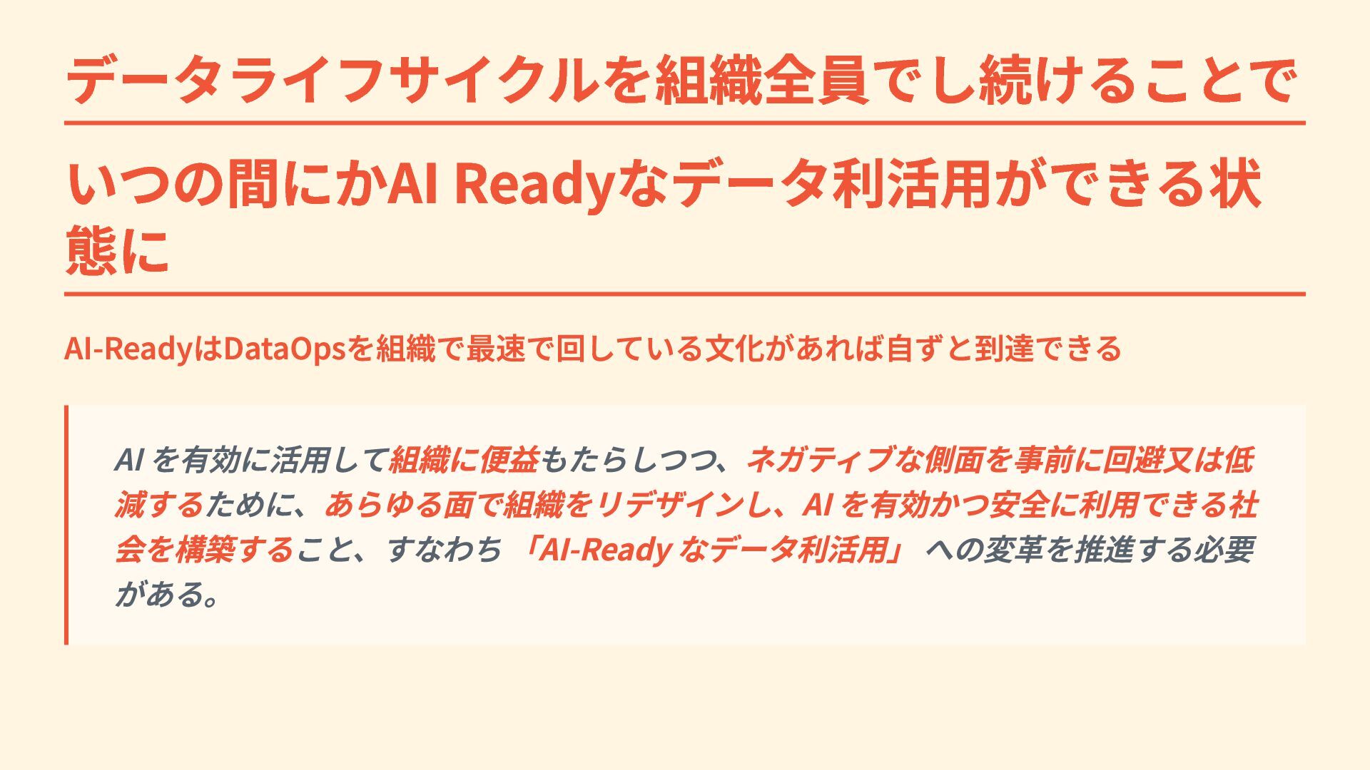 データライフサイクルを組織全員でし続けることで いつの間にかAI Readyなデータ利活用ができる状 態に AI-ReadyはDataOpsを組織で最速で回している文化があれば自ずと到達できる AI を有効に活用して組織に便益もたらしつつ、ネガティブな側面を事前に回避又は低 減するために、あらゆる面で組織をリデザインし、AI を有効かつ安全に利用できる社 会を構築すること、すなわち