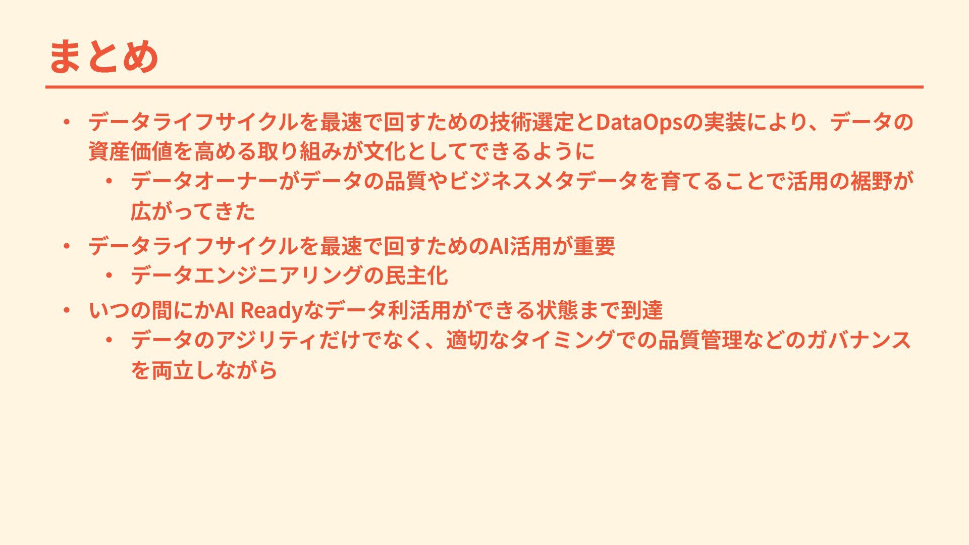 まとめ ・ データライフサイクルを最速で回すための技術選定とDataOpsの実装により、データの 資産価値を高める取り組みが文化としてできるように ・ データオーナーがデータの品質やビジネスメタデータを育てることで活用の裾野が 広がってきた ・ データライフサイクルを最速で回すためのAI活用が重要 ・