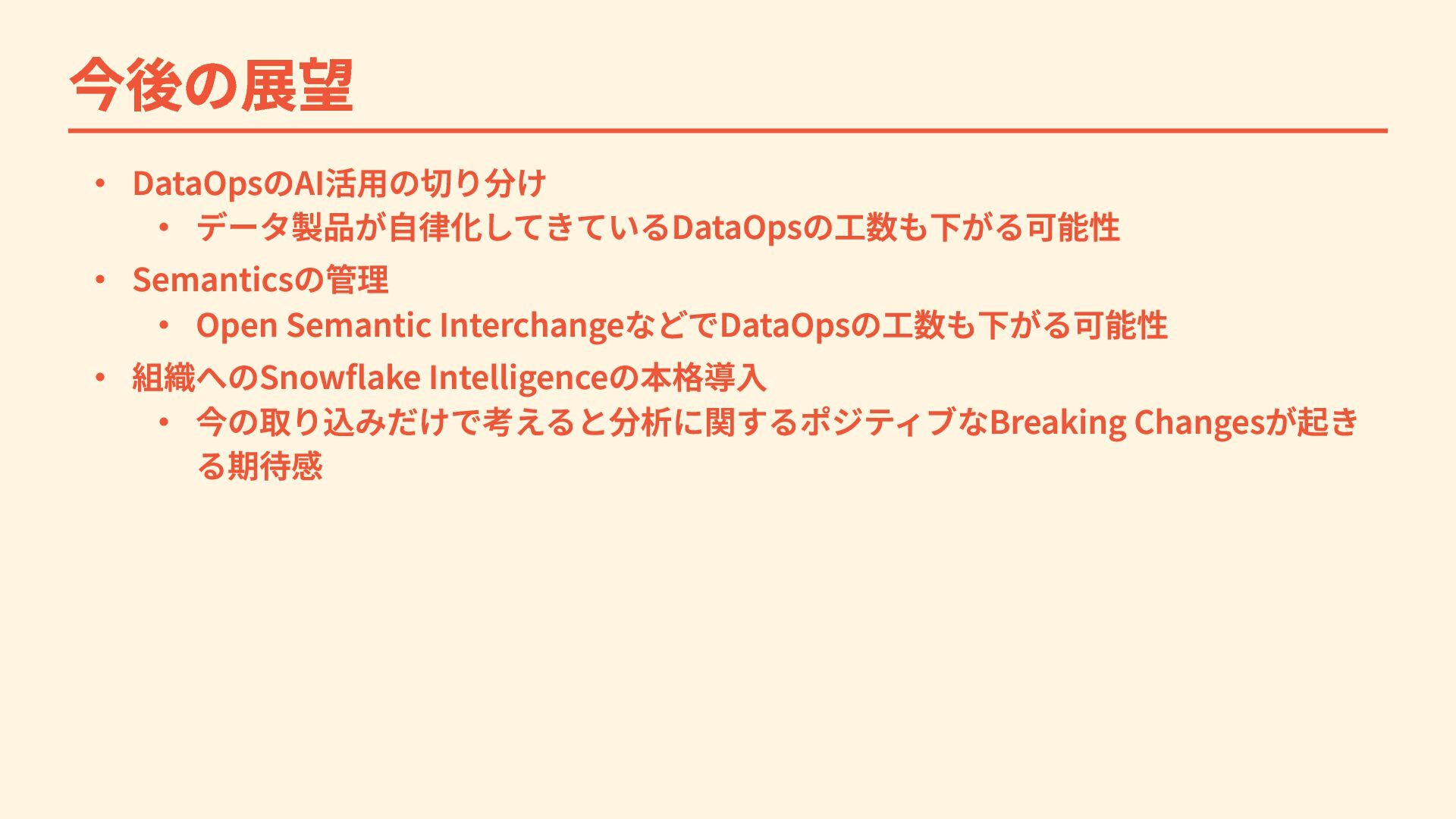 InterchangeなどでDataOpsの工数も下がる可能性 ・ 組織へのSnowflake Intelligenceの本格導入 ・ 今の取り込みだけで考えると分析に関するポジティブなBreaking Changesが起き る期待感