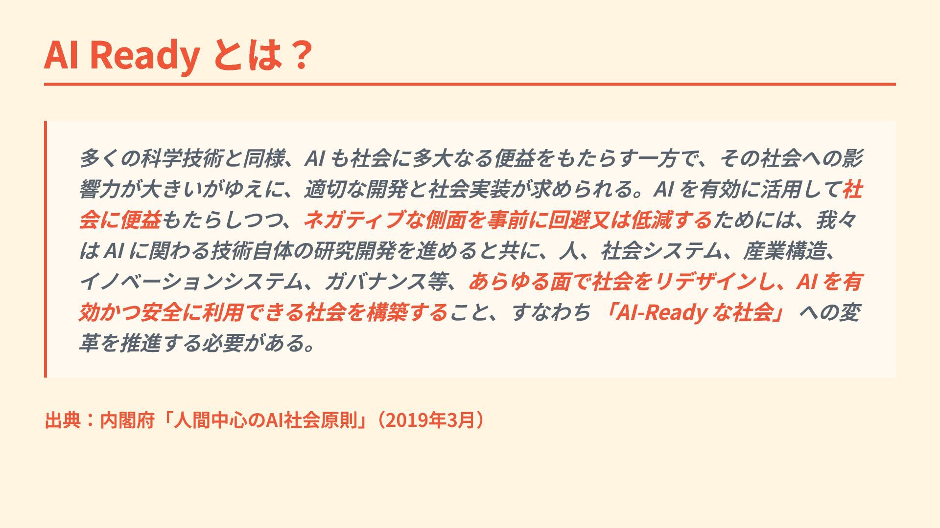 AI Ready とは? 多くの科学技術と同様、AI も社会に多大なる便益をもたらす一方で、その社会への影 響力が大きいがゆえに、適切な開発と社会実装が求められる。AI を有効に活用して社 会に便益もたらしつつ、ネガティブな側面を事前に回避又は低減するためには、我々 は AI