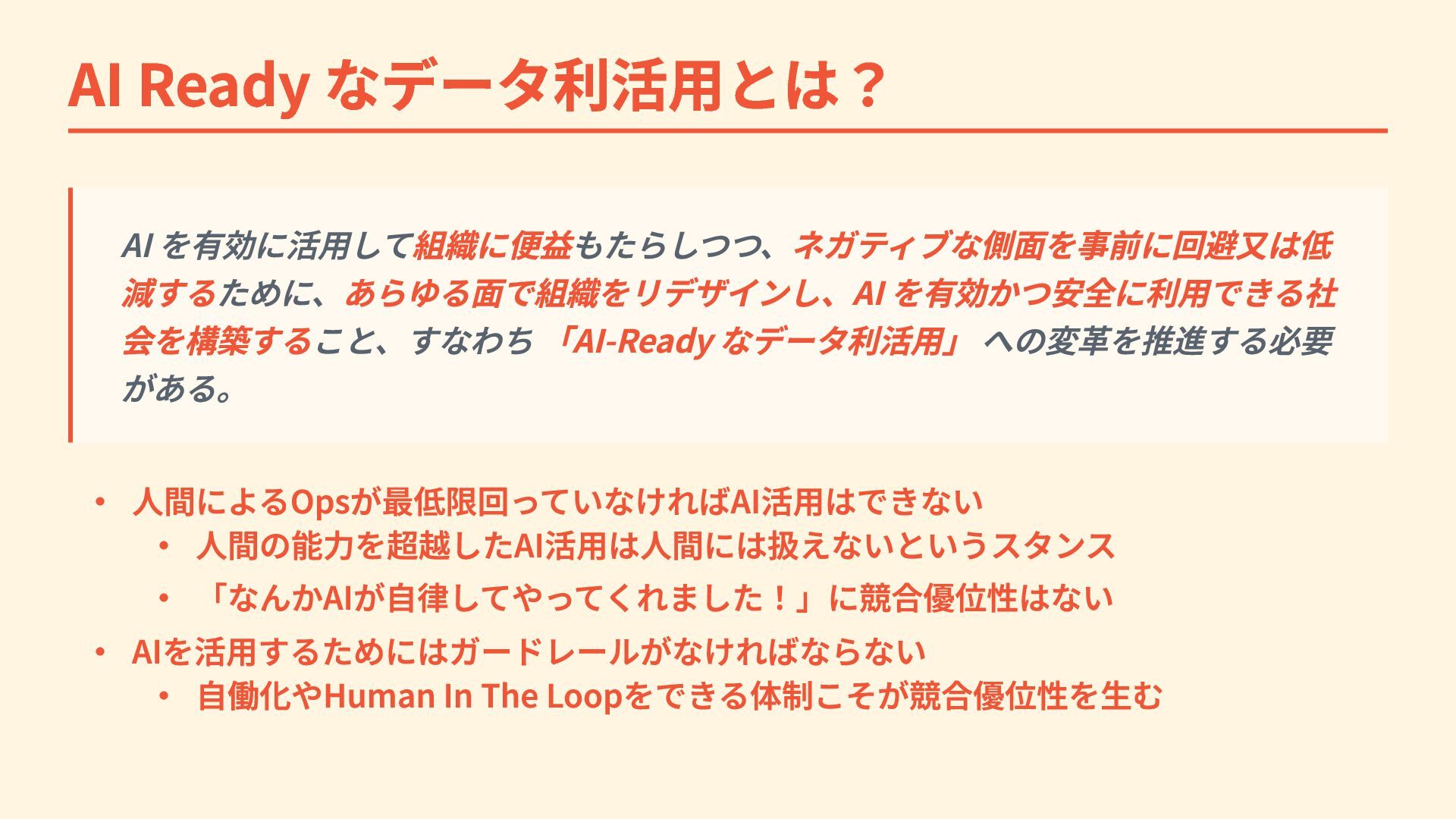 への変革を推進する必要 がある。 ・ 人間によるOpsが最低限回っていなければAI活用はできない ・ 人間の能力を超越したAI活用は人間には扱えないというスタンス ・ 「なんかAIが自律してやってくれました!」に競合優位性はない ・ AIを活用するためにはガードレールがなければならない ・ 自働化やHuman In The Loopをできる体制こそが競合優位性を生む