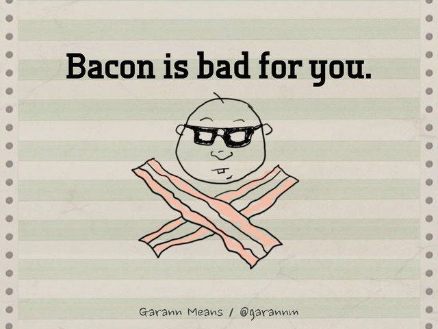 This isn't a talk about this awesome conference, nor about nitrates (which I'm not qualified to discuss). It's a talk about developer monoculture and how it puts all of us (even the vegans) at risk. Sure, we're portrayed as buffoons in popular sitcoms, and people make broad and often incorrect assumptions about our social skills, but there are more tangible dangers in allowing - and even encouraging - others to sum us all up with a collection of specious tropes. People outside our little profession can, and do, use this to take advantage of us. I'm not going to try and convince you not to have bacon on your sandwich, but I think the results when we portray ourselves as a group of people who uniformly place great value on cured pork and little value on our lives outside our work are results worth examining.