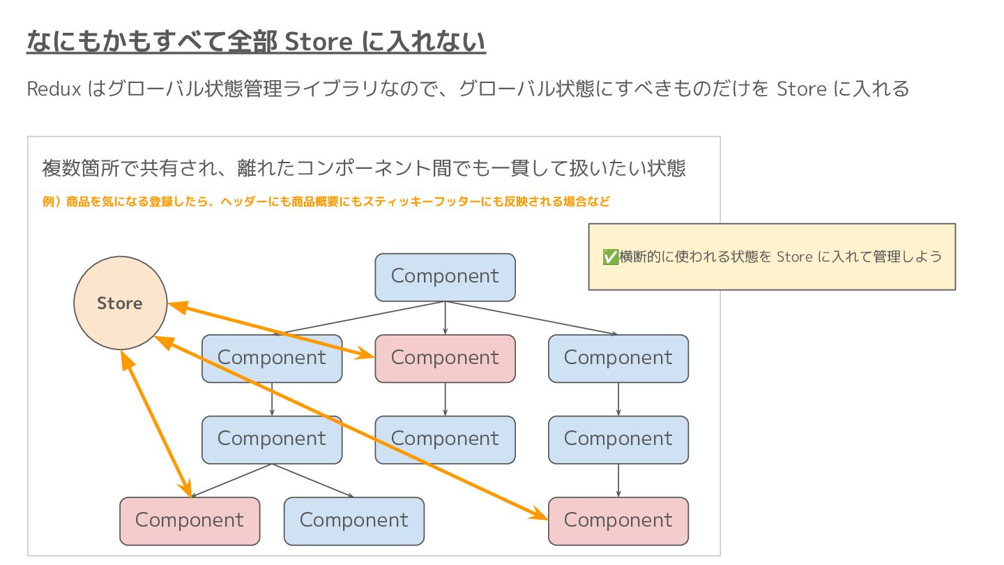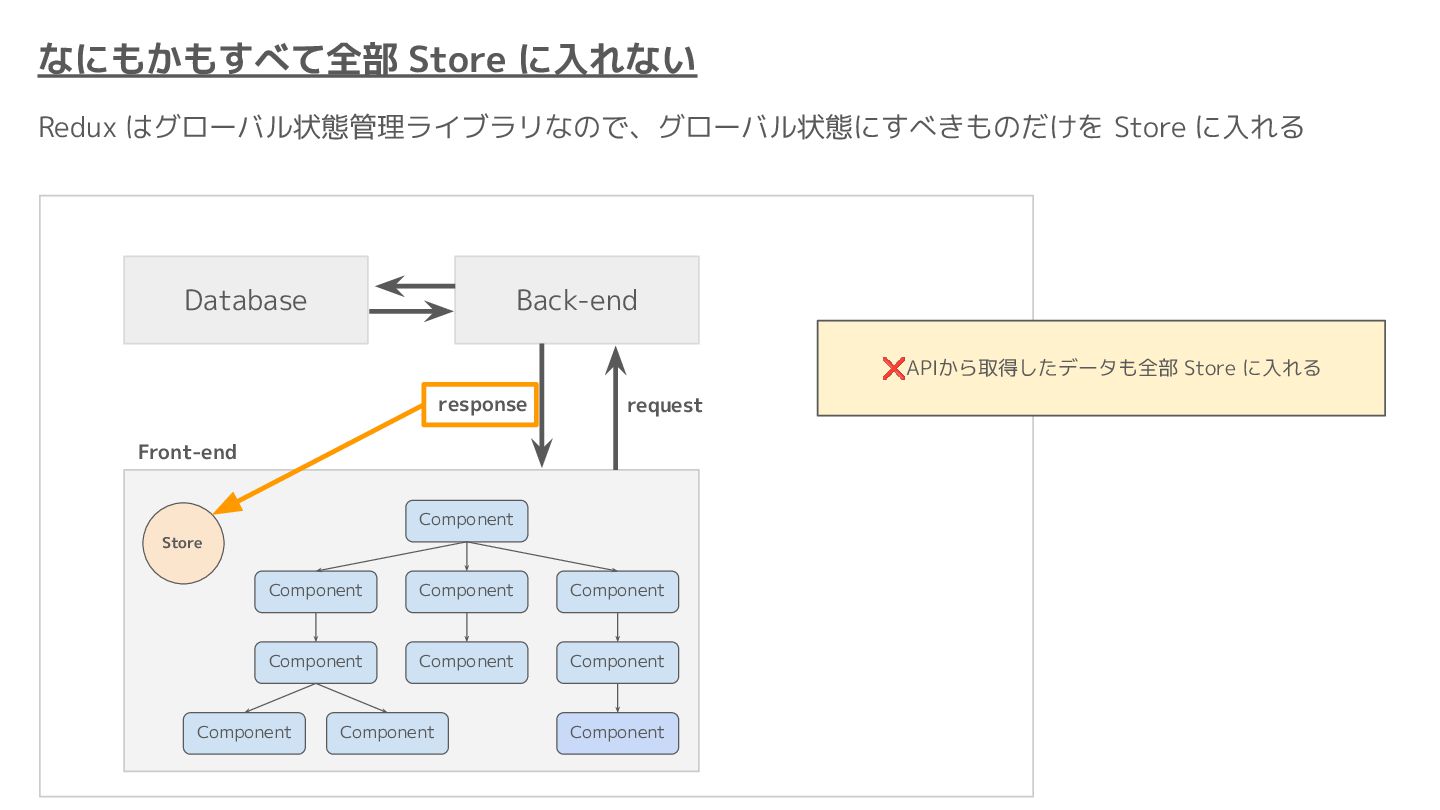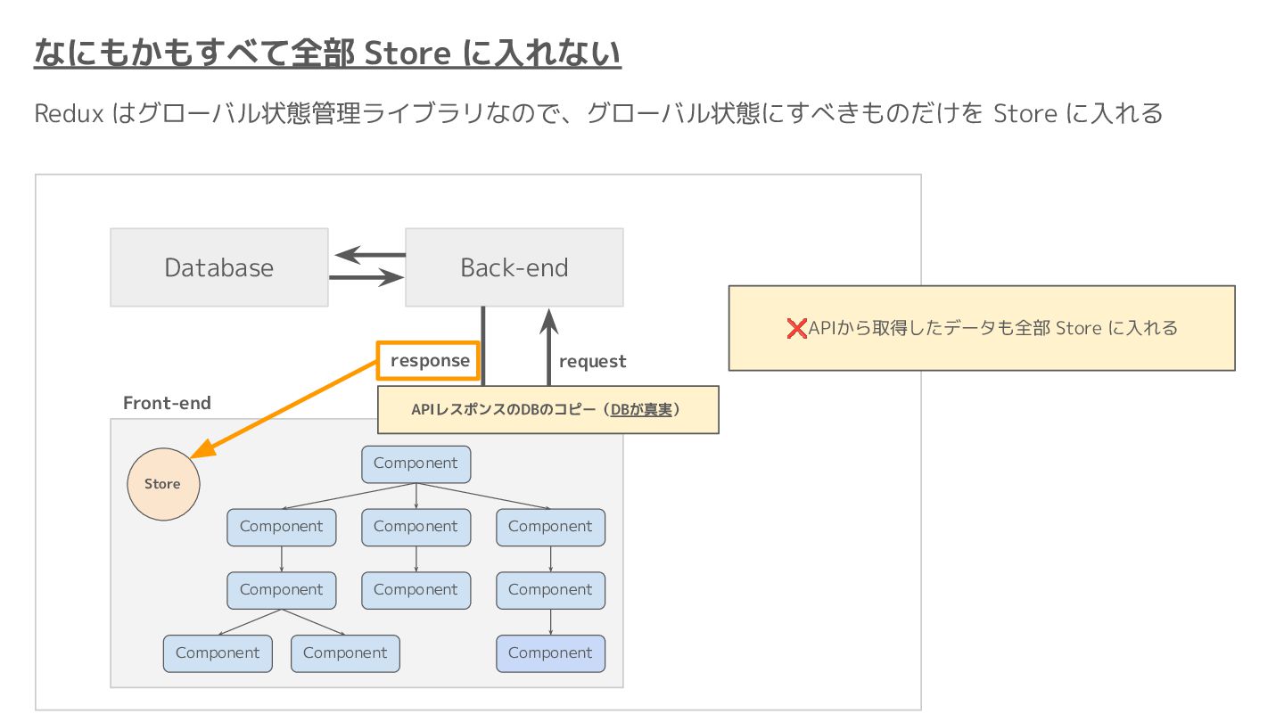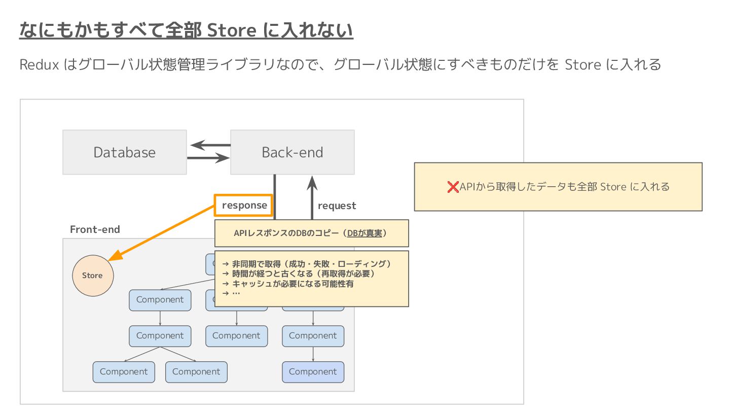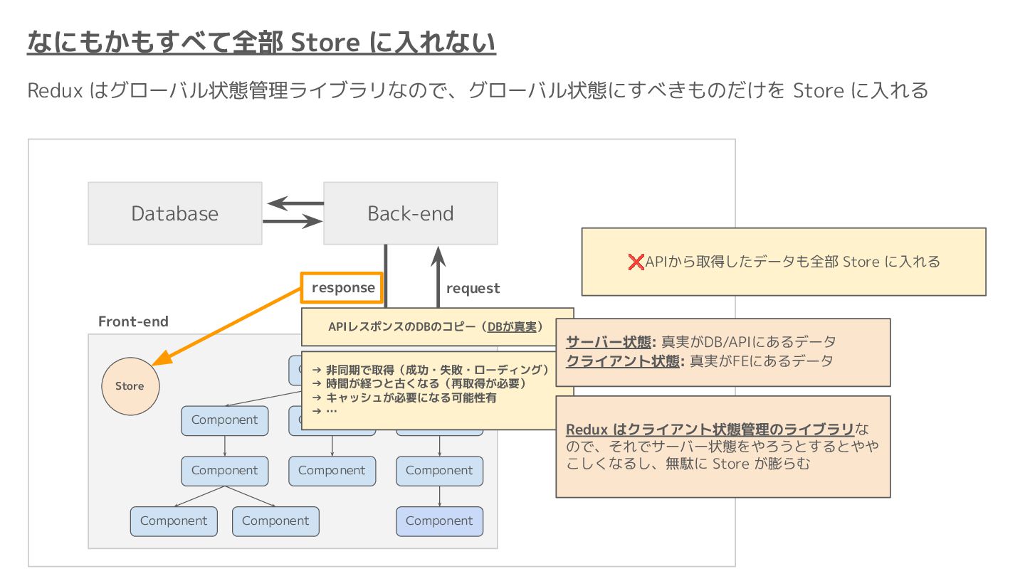 Component Component Component Component Component Component Component Store Front-end Back-end Database request response APIレスポンスのDBのコピー(DBが真実) ❌APIから取得したデータも全部 Store に入れる → 非同期で取得(成功・失敗・ローディング) → 時間が経つと古くなる(再取得が必要) → キャッシュが必要になる可能性有 → … Redux はクライアント状態管理のライブラリな ので、それでサーバー状態をやろうとするとやや こしくなるし、無駄に Store が膨らむ サーバー状態: 真実がDB/APIにあるデータ クライアント状態: 真実がFEにあるデータ