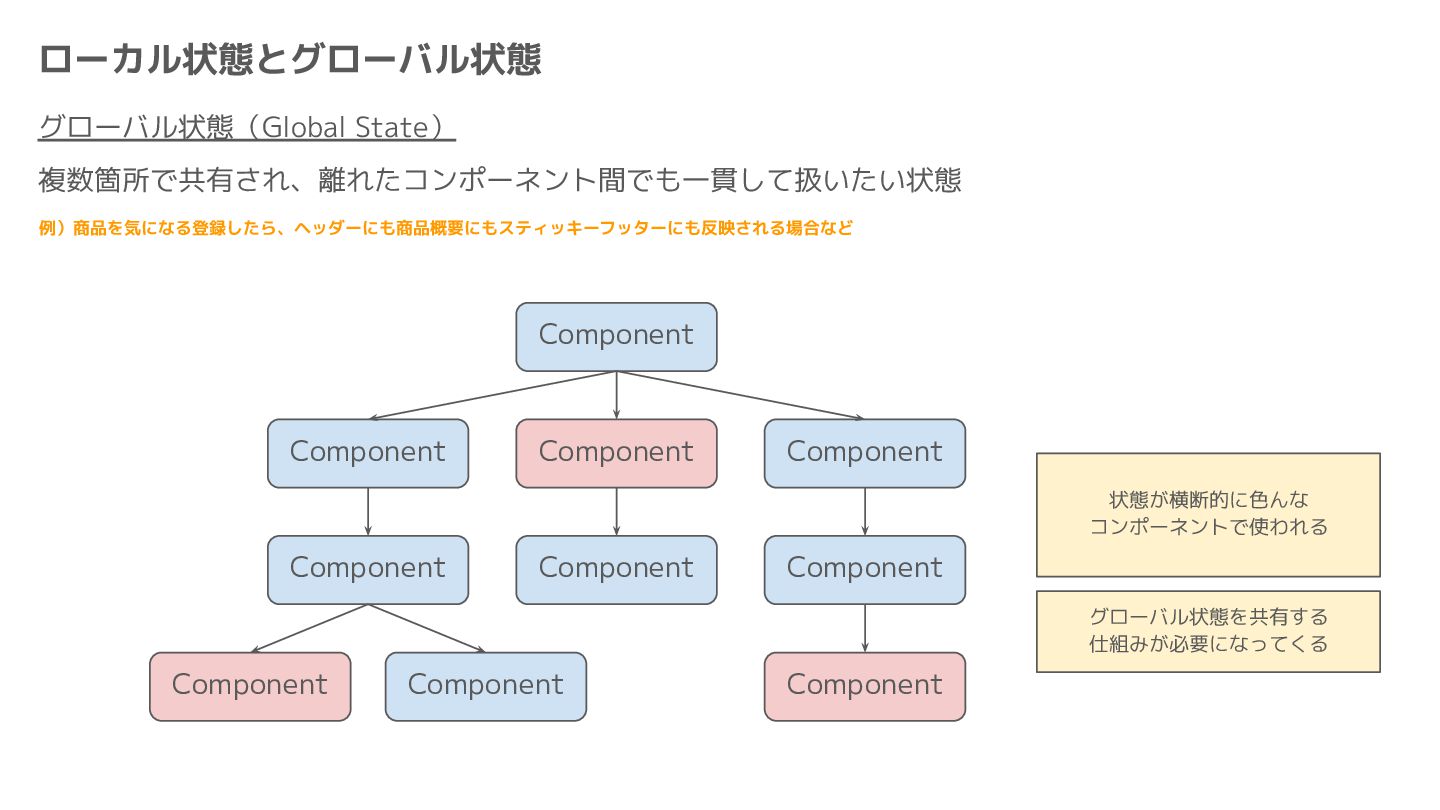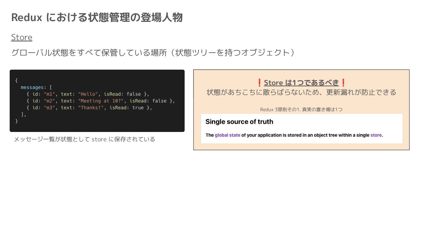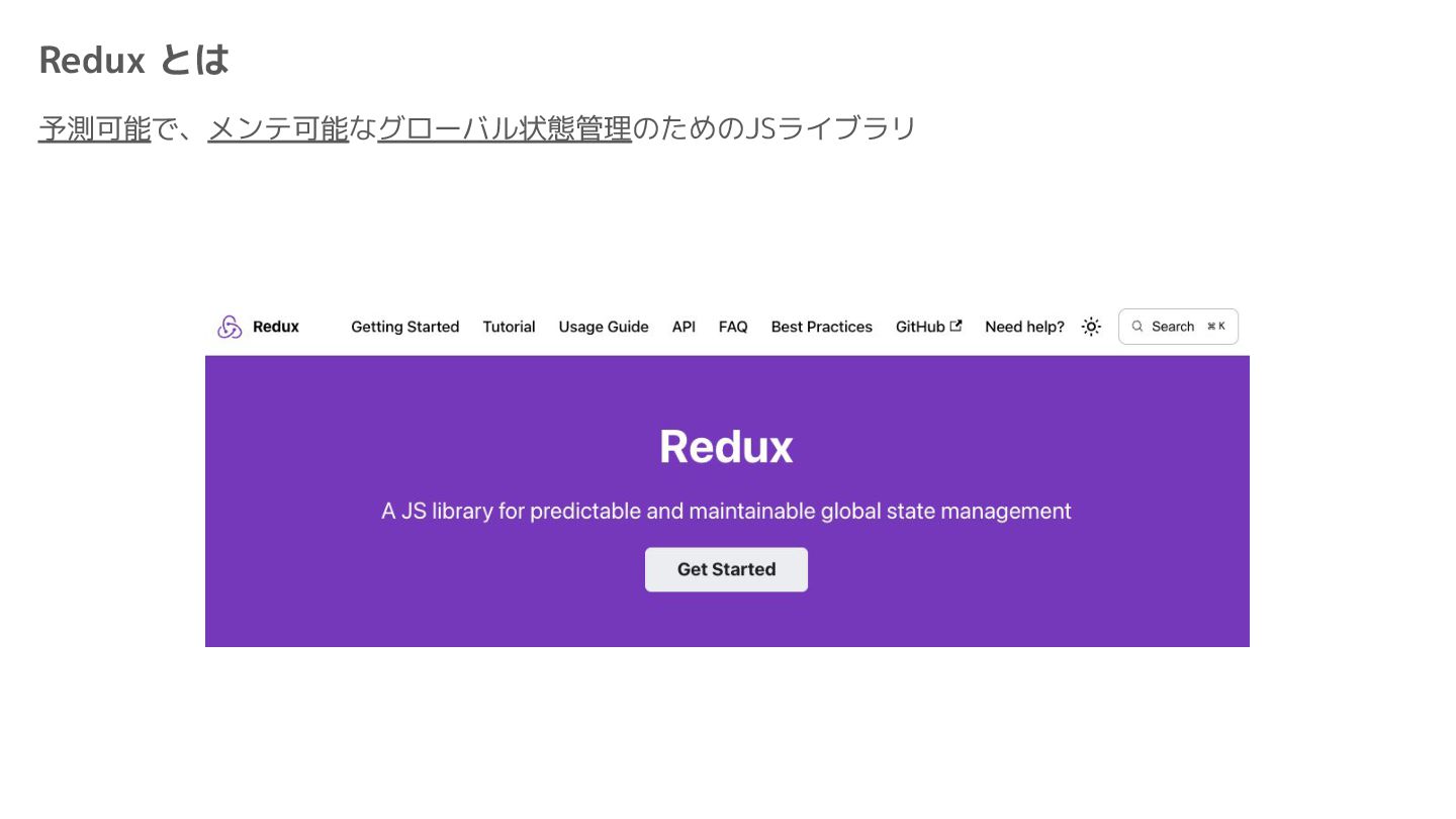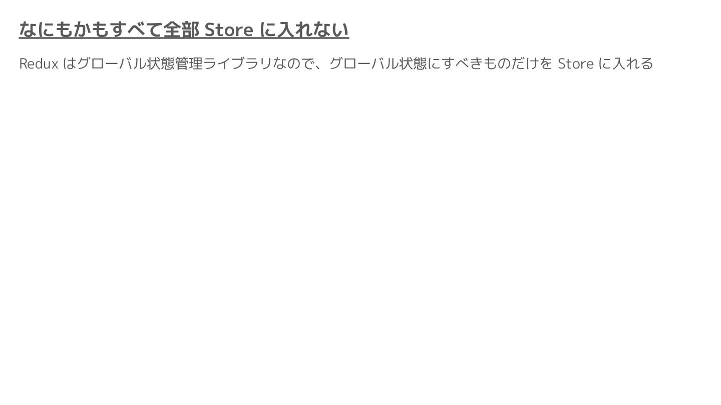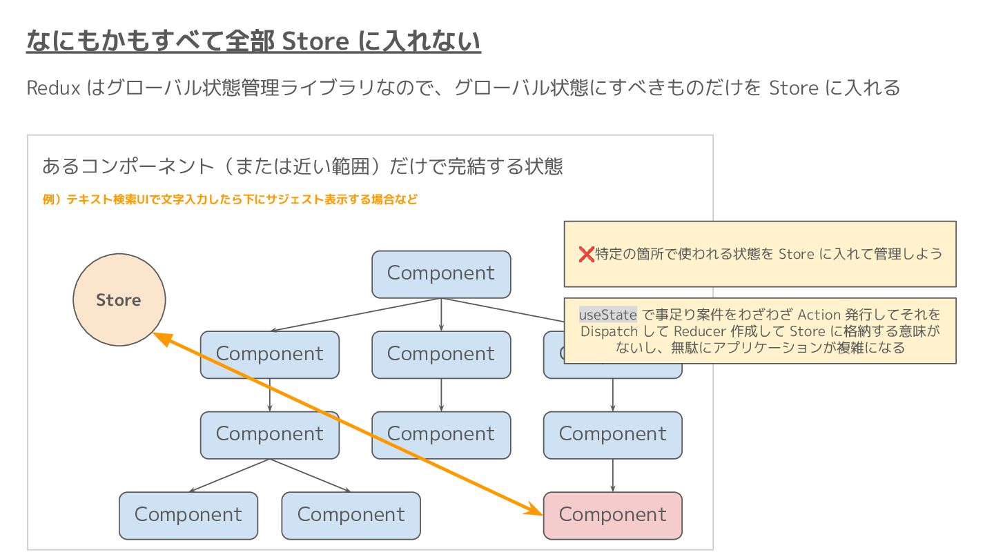 Component Component Component Component Component Component Component Store Front-end Back-end Database request response APIレスポンスのDBのコピー(DBが真実) ❌APIから取得したデータも全部 Store に入れる → 非同期で取得(成功・失敗・ローディング) → 時間が経つと古くなる(再取得が必要) → キャッシュが必要になる可能性有 → … Redux はクライアント状態管理のライブラリな ので、それでサーバー状態をやろうとするとやや こしくなるし、無駄に Store が膨らむ サーバー状態: 真実がDB/APIにあるデータ クライアント状態: 真実がFEにあるデータ