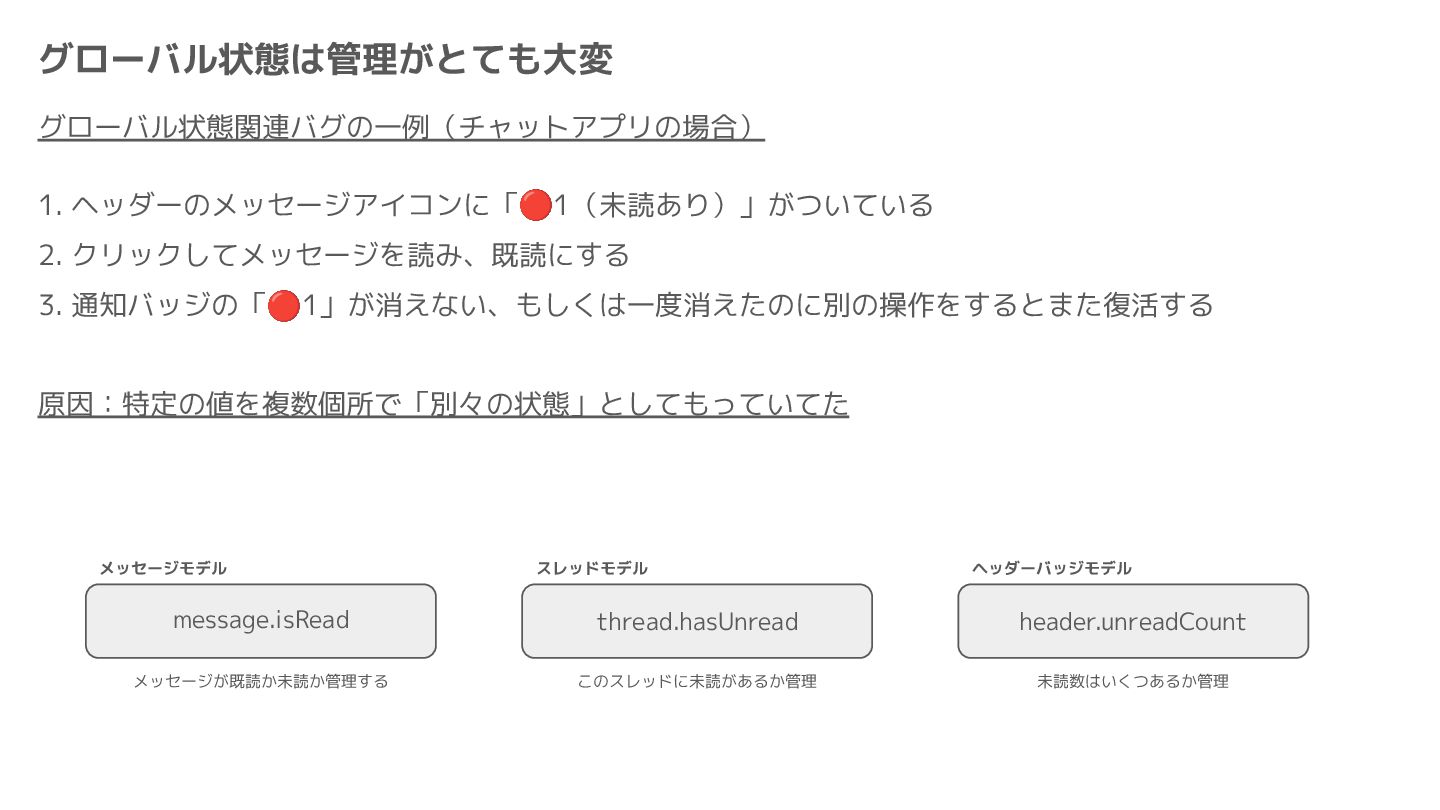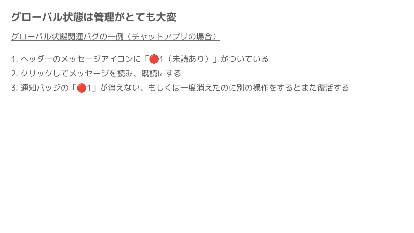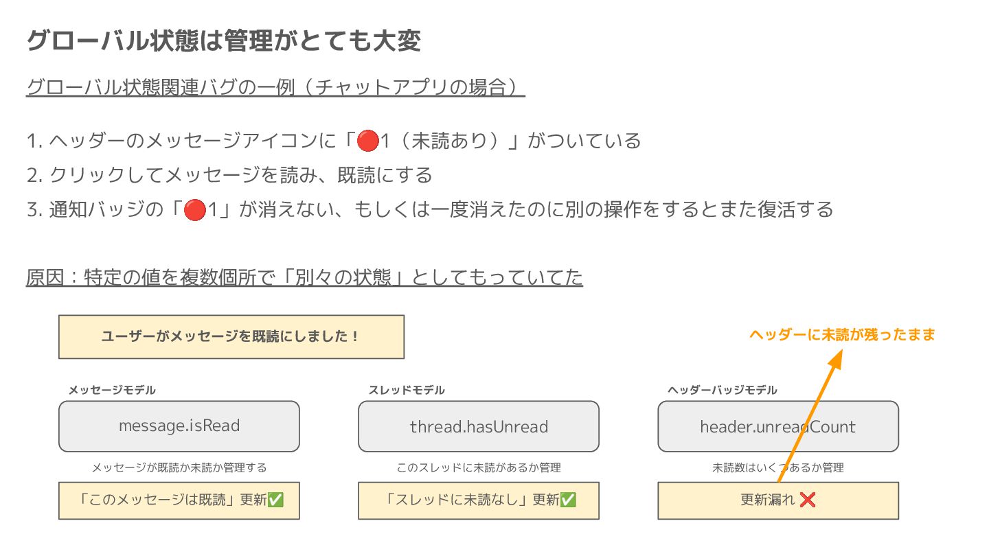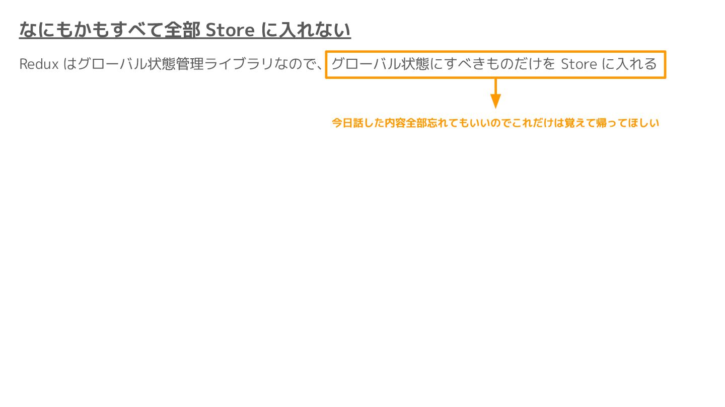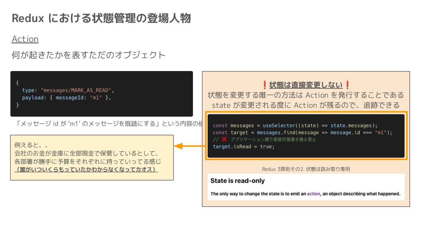 Component Component Component Component Component Component Component Store Front-end Back-end Database request response APIレスポンスのDBのコピー(DBが真実) ❌APIから取得したデータも全部 Store に入れる → 非同期で取得(成功・失敗・ローディング) → 時間が経つと古くなる(再取得が必要) → キャッシュが必要になる可能性有 → … Redux はクライアント状態管理のライブラリな ので、それでサーバー状態をやろうとするとやや こしくなるし、無駄に Store が膨らむ サーバー状態: 真実がDB/APIにあるデータ クライアント状態: 真実がFEにあるデータ