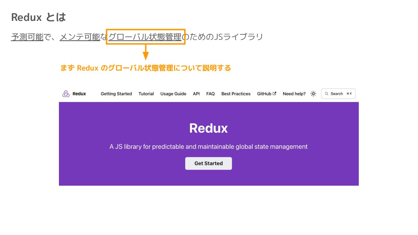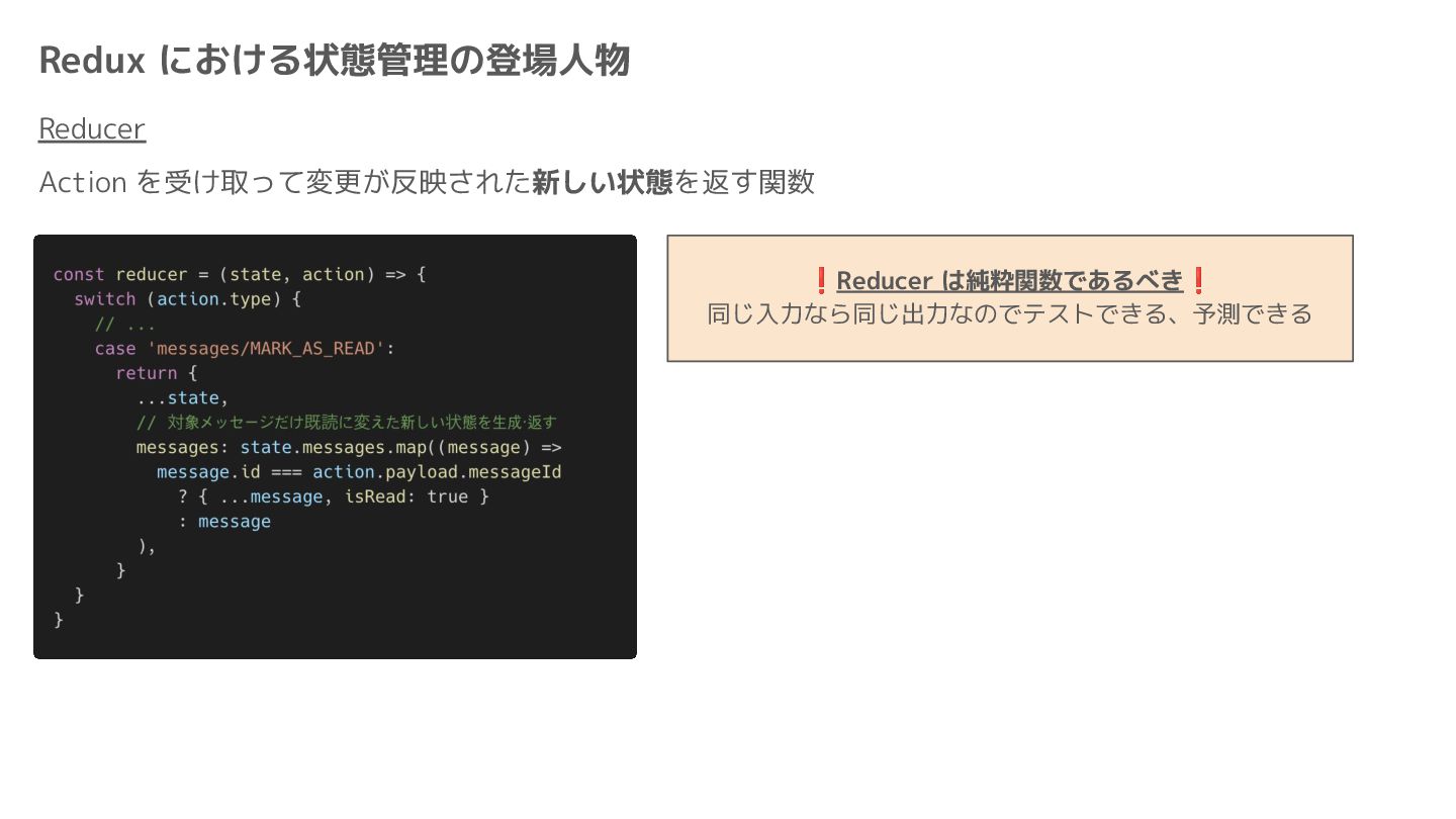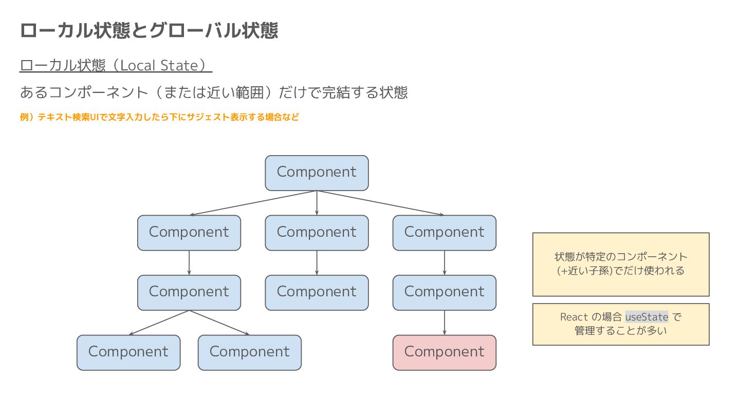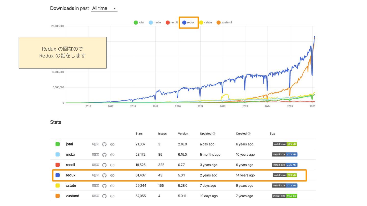 Component Component Component Component Component Component Component Store Front-end Back-end Database request response APIレスポンスのDBのコピー(DBが真実) ❌APIから取得したデータも全部 Store に入れる → 非同期で取得(成功・失敗・ローディング) → 時間が経つと古くなる(再取得が必要) → キャッシュが必要になる可能性有 → … Redux はクライアント状態管理のライブラリな ので、それでサーバー状態をやろうとするとやや こしくなるし、無駄に Store が膨らむ サーバー状態: 真実がDB/APIにあるデータ クライアント状態: 真実がFEにあるデータ