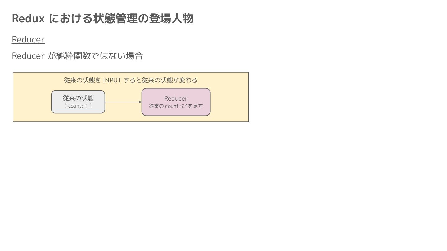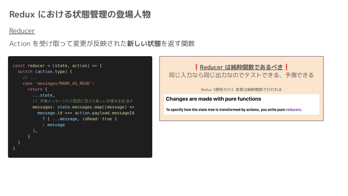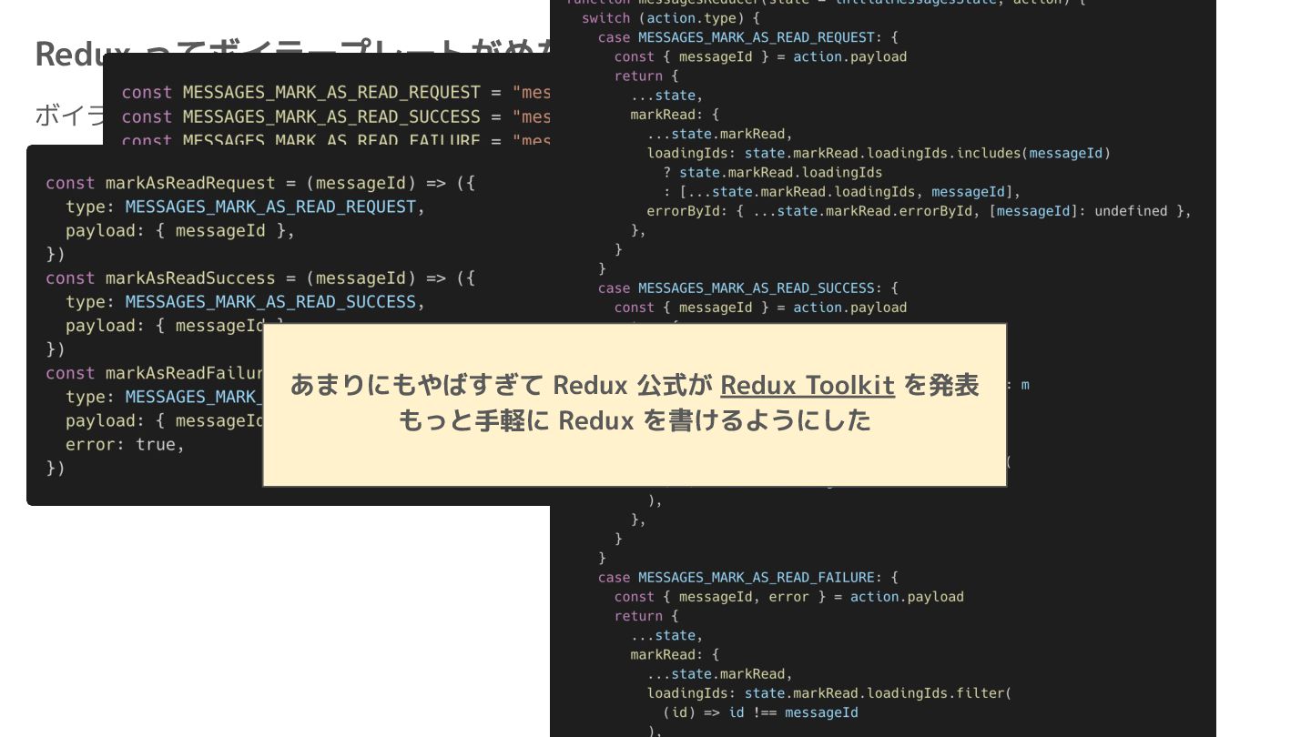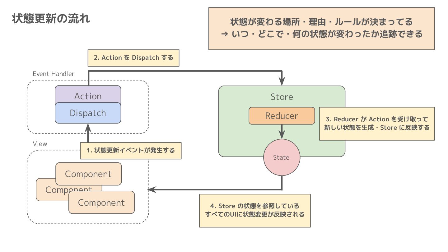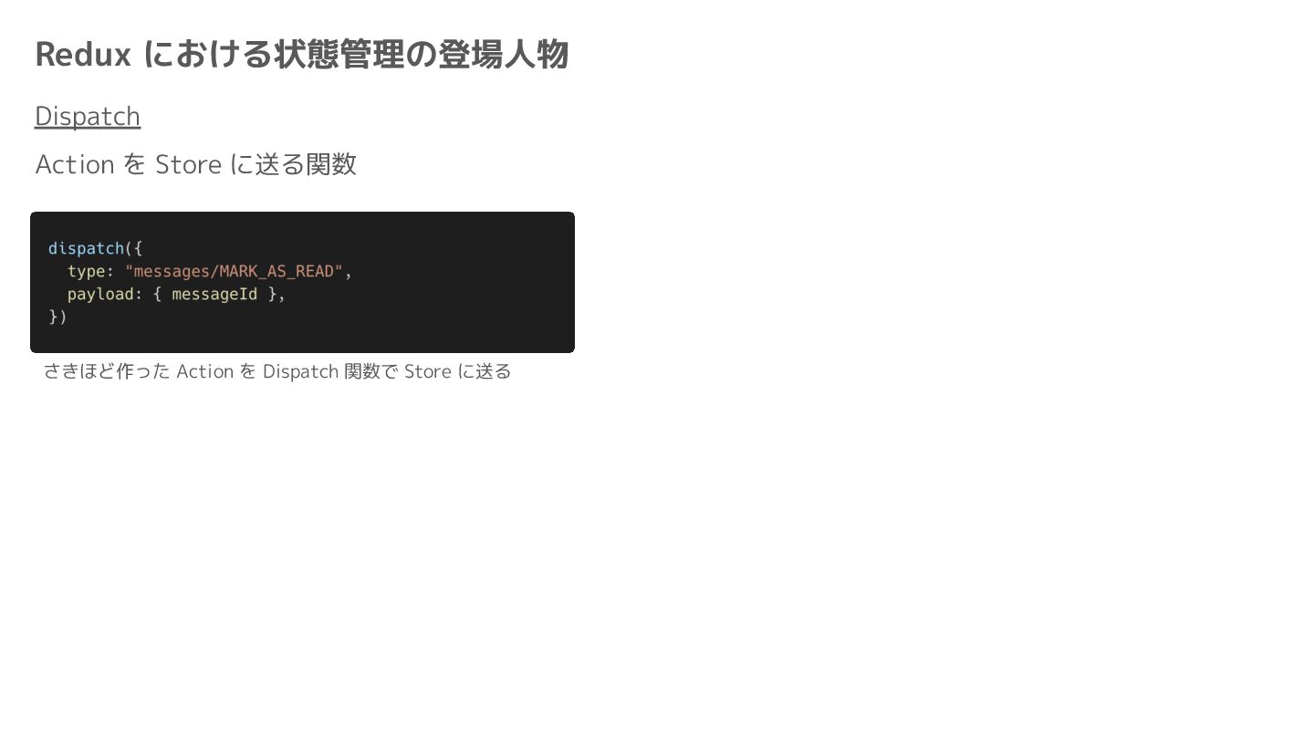 Component Component Component Component Component Component Component Store Front-end Back-end Database request response APIレスポンスのDBのコピー(DBが真実) ❌APIから取得したデータも全部 Store に入れる → 非同期で取得(成功・失敗・ローディング) → 時間が経つと古くなる(再取得が必要) → キャッシュが必要になる可能性有 → … Redux はクライアント状態管理のライブラリな ので、それでサーバー状態をやろうとするとやや こしくなるし、無駄に Store が膨らむ サーバー状態: 真実がDB/APIにあるデータ クライアント状態: 真実がFEにあるデータ