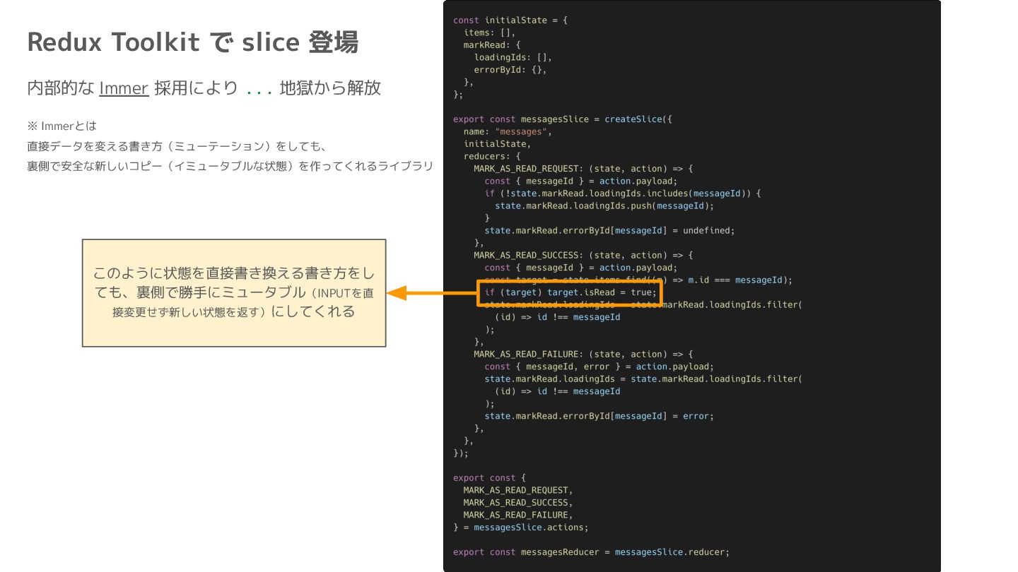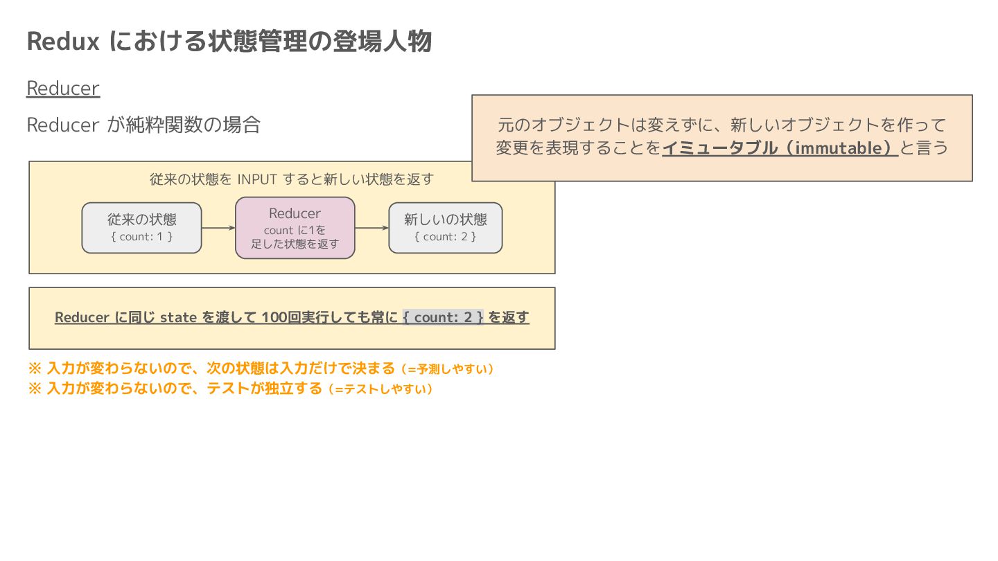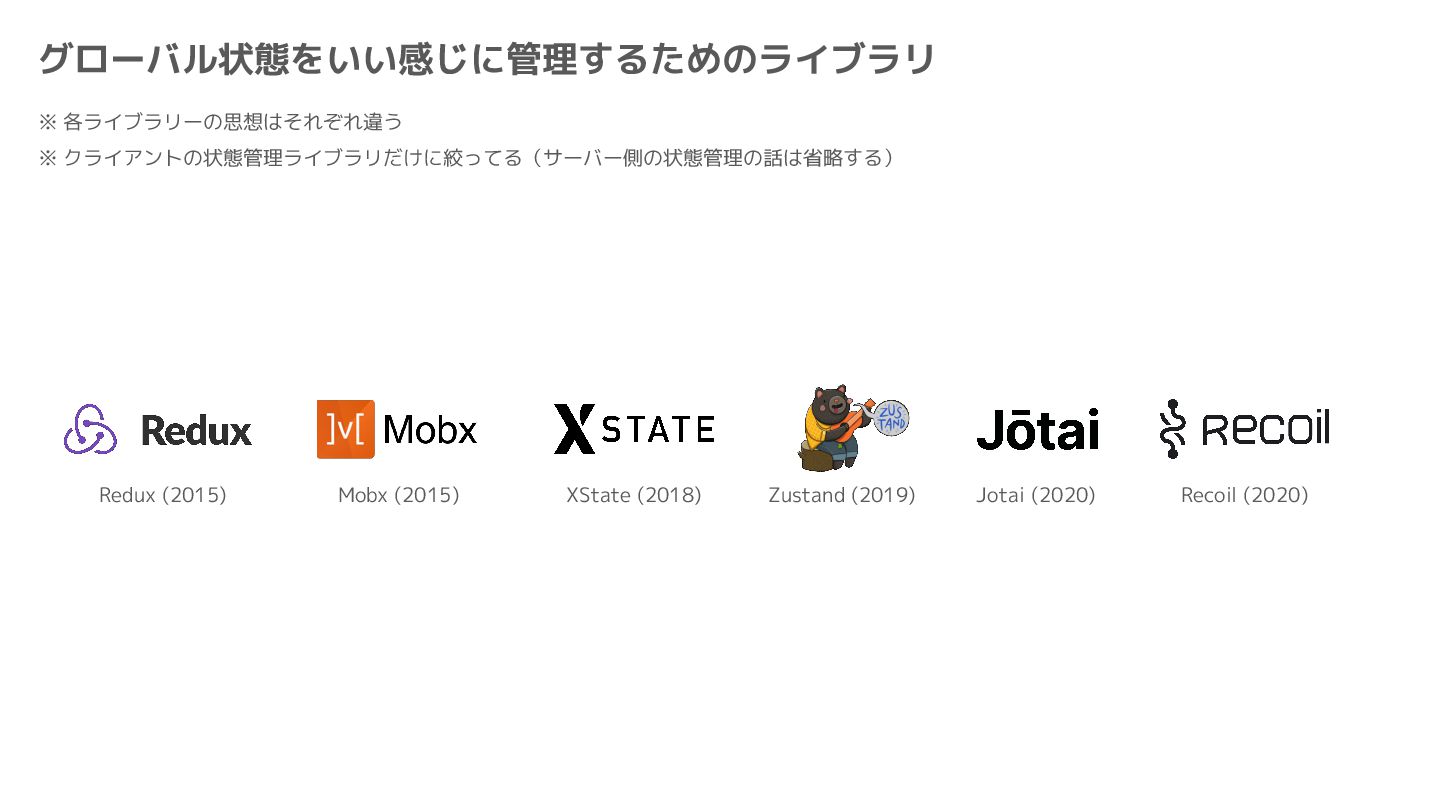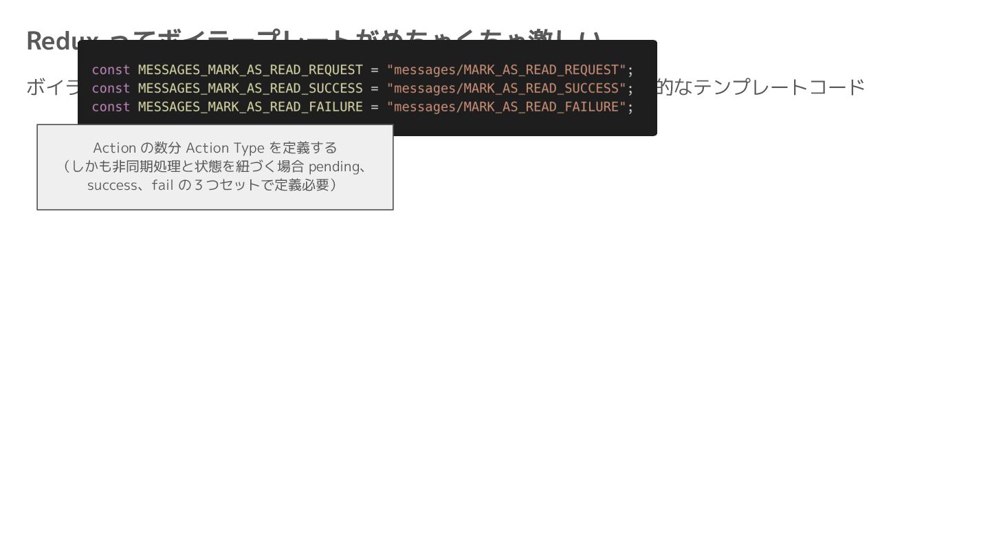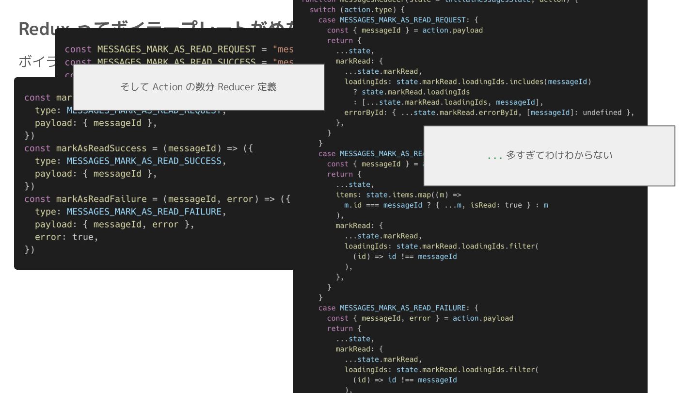 Component Component Component Component Component Component Component Store Front-end Back-end Database request response APIレスポンスのDBのコピー(DBが真実) ❌APIから取得したデータも全部 Store に入れる → 非同期で取得(成功・失敗・ローディング) → 時間が経つと古くなる(再取得が必要) → キャッシュが必要になる可能性有 → … Redux はクライアント状態管理のライブラリな ので、それでサーバー状態をやろうとするとやや こしくなるし、無駄に Store が膨らむ サーバー状態: 真実がDB/APIにあるデータ クライアント状態: 真実がFEにあるデータ