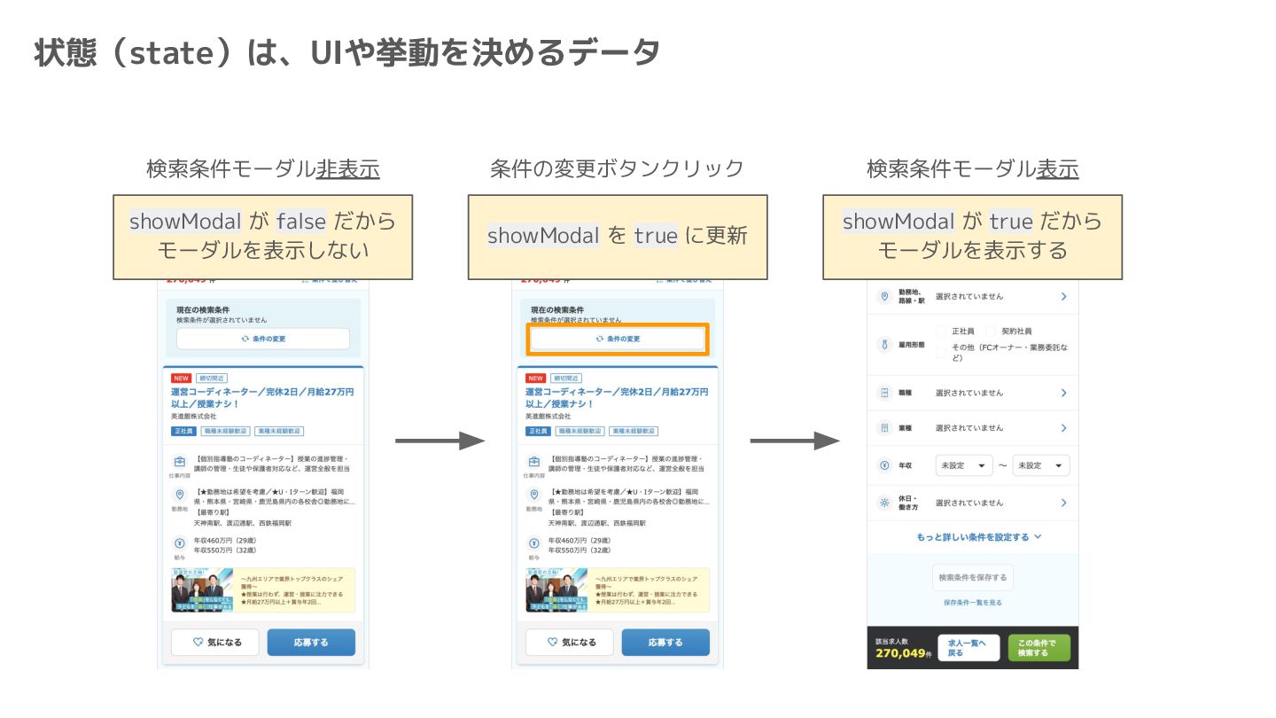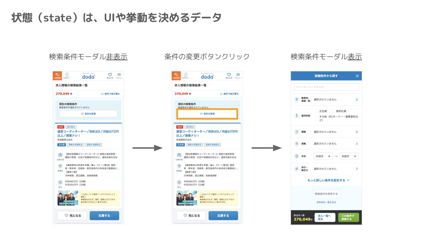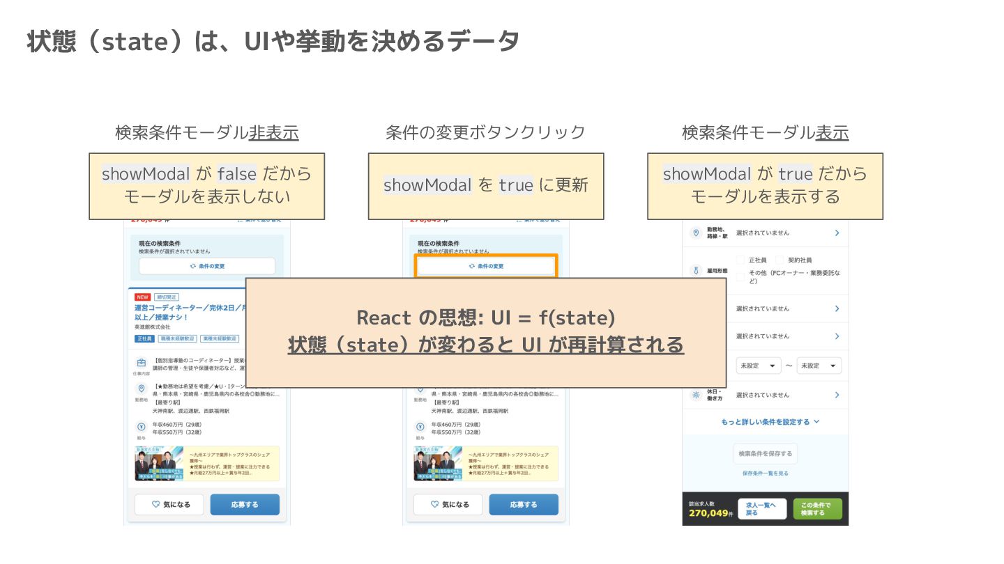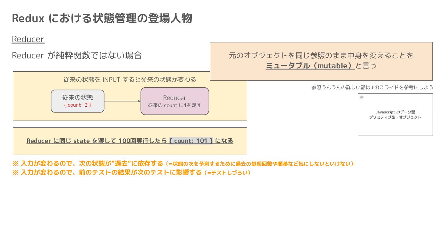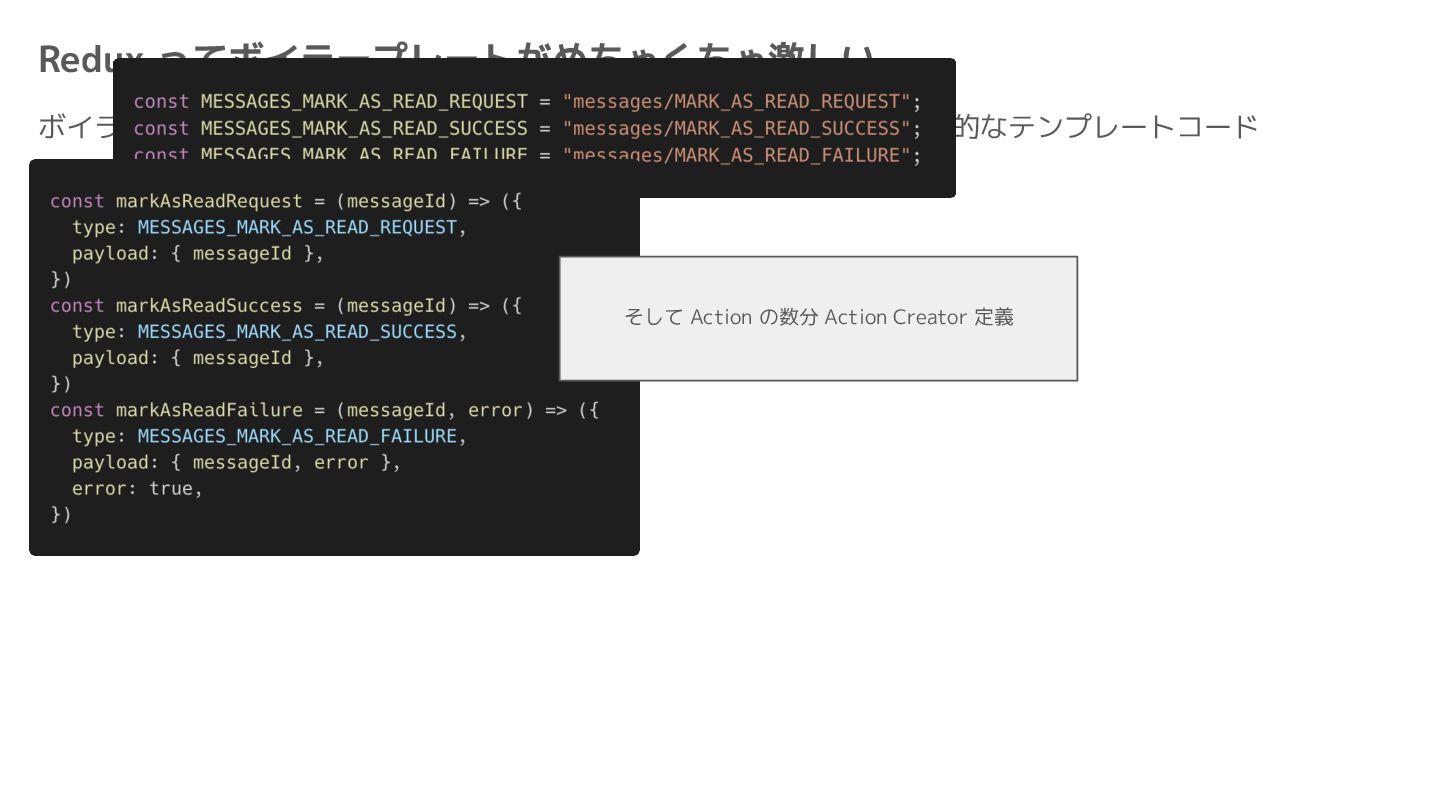 Component Component Component Component Component Component Component Store Front-end Back-end Database request response APIレスポンスのDBのコピー(DBが真実) ❌APIから取得したデータも全部 Store に入れる → 非同期で取得(成功・失敗・ローディング) → 時間が経つと古くなる(再取得が必要) → キャッシュが必要になる可能性有 → … Redux はクライアント状態管理のライブラリな ので、それでサーバー状態をやろうとするとやや こしくなるし、無駄に Store が膨らむ サーバー状態: 真実がDB/APIにあるデータ クライアント状態: 真実がFEにあるデータ
