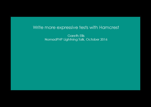 not a string”); } //do something } Not just for tests – reduce boilerplate function doSomethingToAString($string) { assertThat($string, is(stringValue())); //throws \Hamcrest\AssertionError //do something }