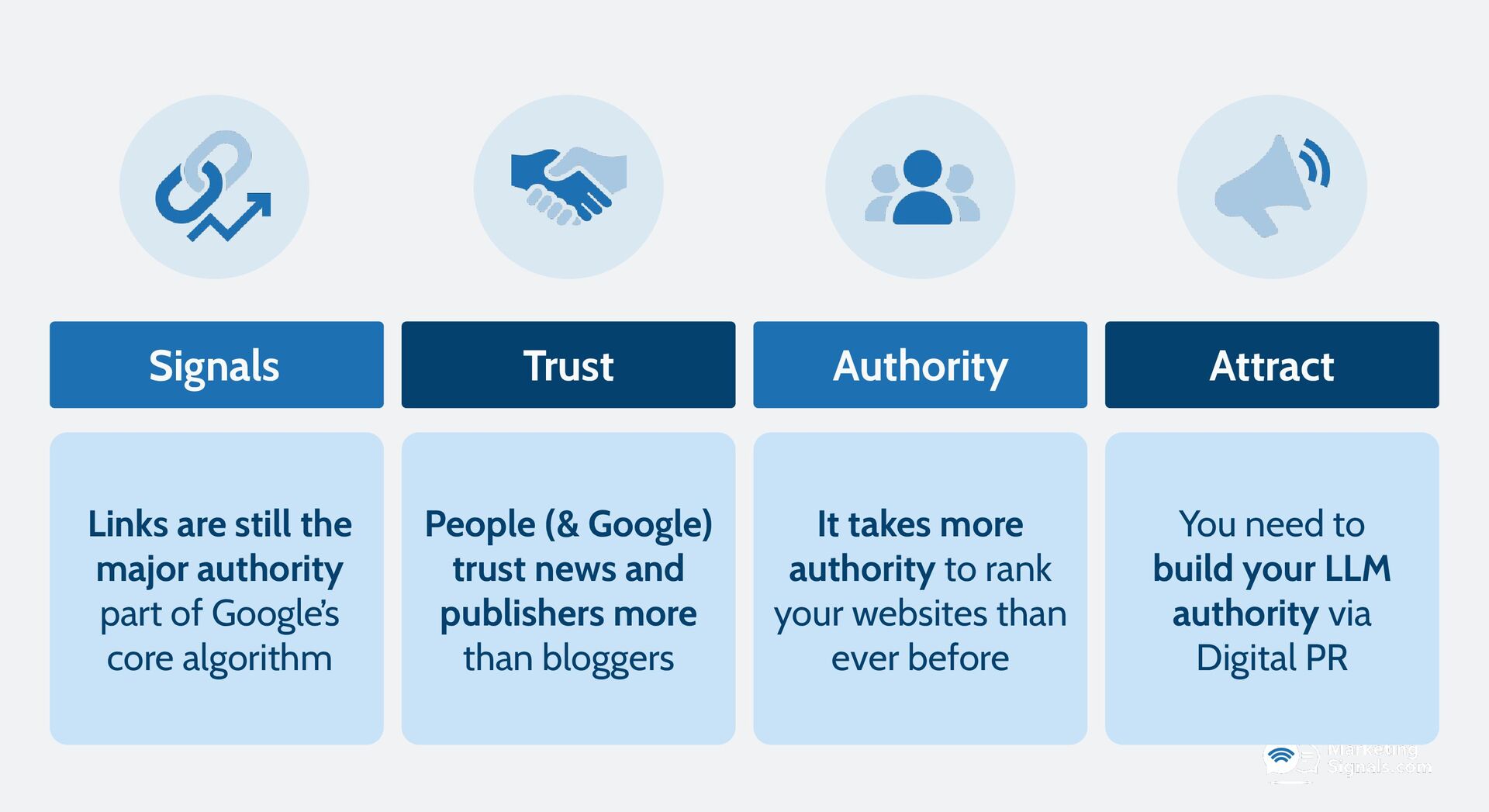 A presentation on the importance of DigitalPR and authority signals via the EEAT framework to ensure your brand assets are visible across both Google and LLM interfaces like ChatGPT, Gemini and more. It stresses the importance of being discovered by Google, AI and your current and prospective users across all digital surfaces.