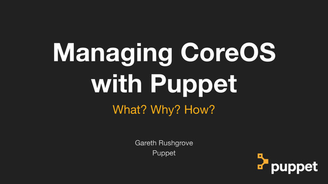 A quick look at how to use Puppet with the CoreOS operating system. A little background on what configuration management really is, how to use Puppet on a container-centric operating system, and some of the advantages of doing so.