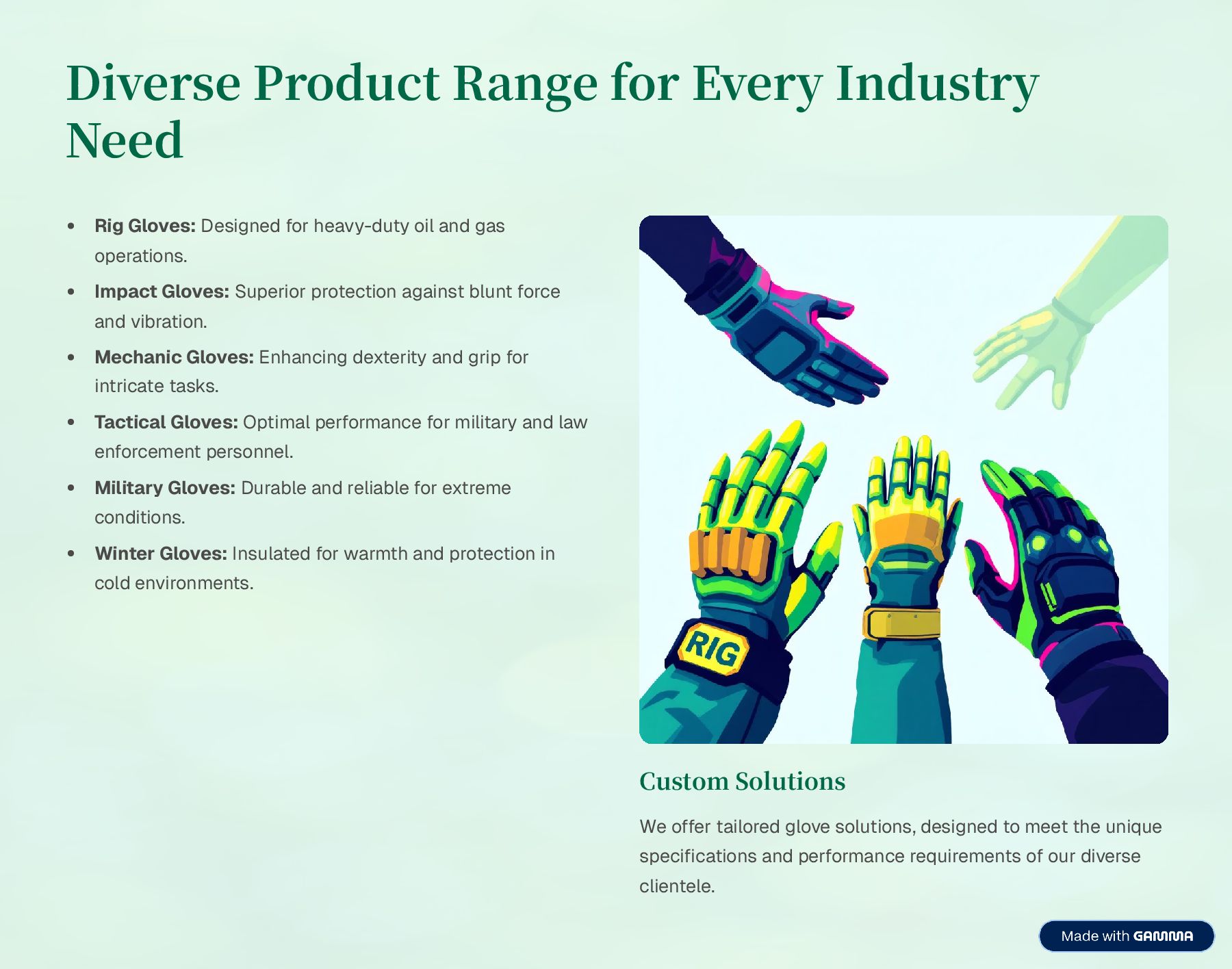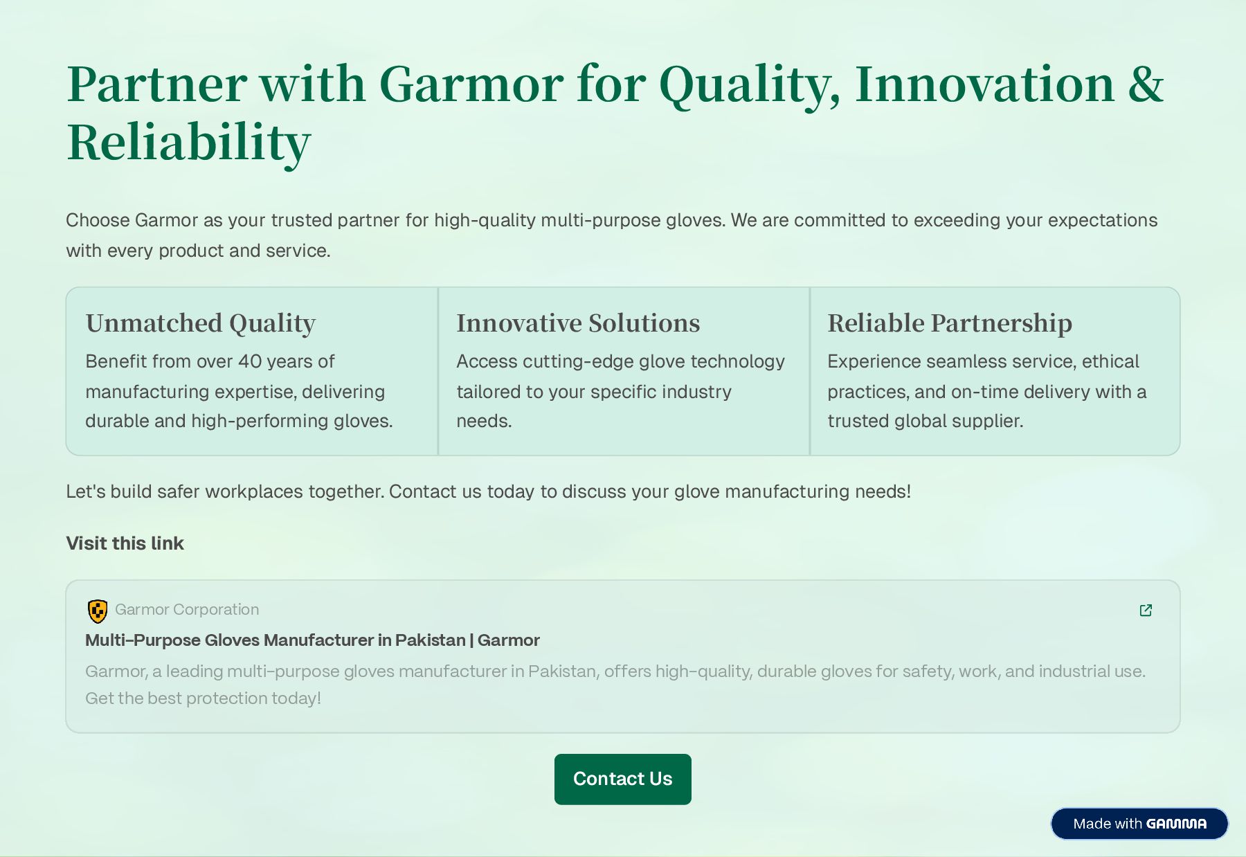Garmor Corporation is a leading multi-purpose gloves manufacturer in Pakistan, producing high-quality, durable, and customizable gloves for industrial and professional use. Based in Sialkot, we offer OEM and bulk manufacturing with strict quality control for global markets.