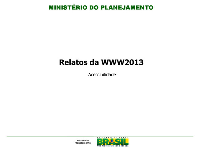 que trata especificamente de Acessibilidade • O tema desse ano era BYOD – Bring Your Own Device • Accessibility-related issues of using one’s own devices • Developing accessible user interfaces for different devices • Web authoring guidelines and tools • Mobile accessibility • Design and best practice to support Web accessibility • End user tools • Accessibility guidelines, best practice, evaluation techniques, and tools • ...