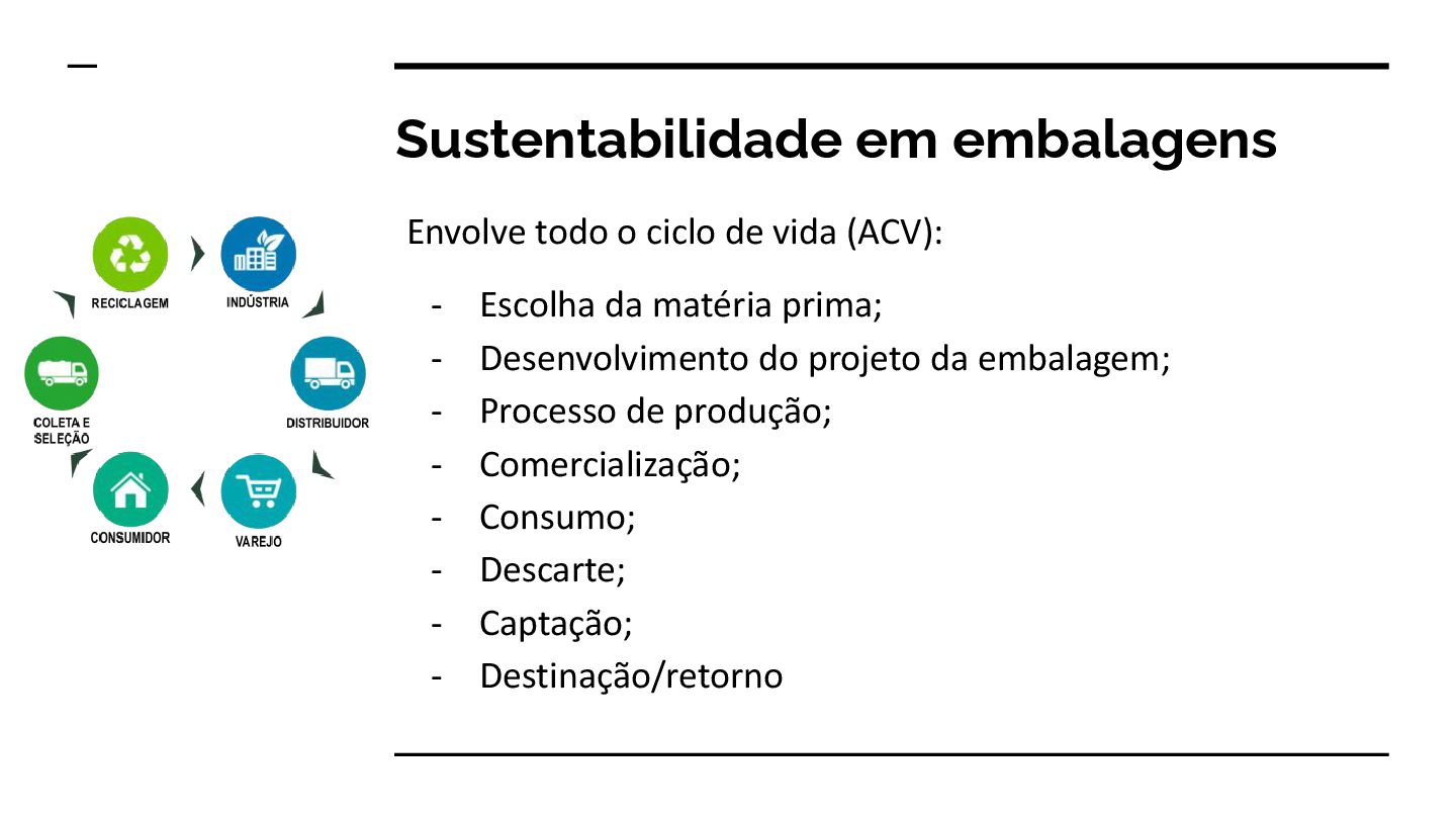 - Escolha da matéria prima; - Desenvolvimento do projeto da embalagem; - Processo de produção; - Comercialização; - Consumo; - Descarte; - Captação; - Destinação/retorno