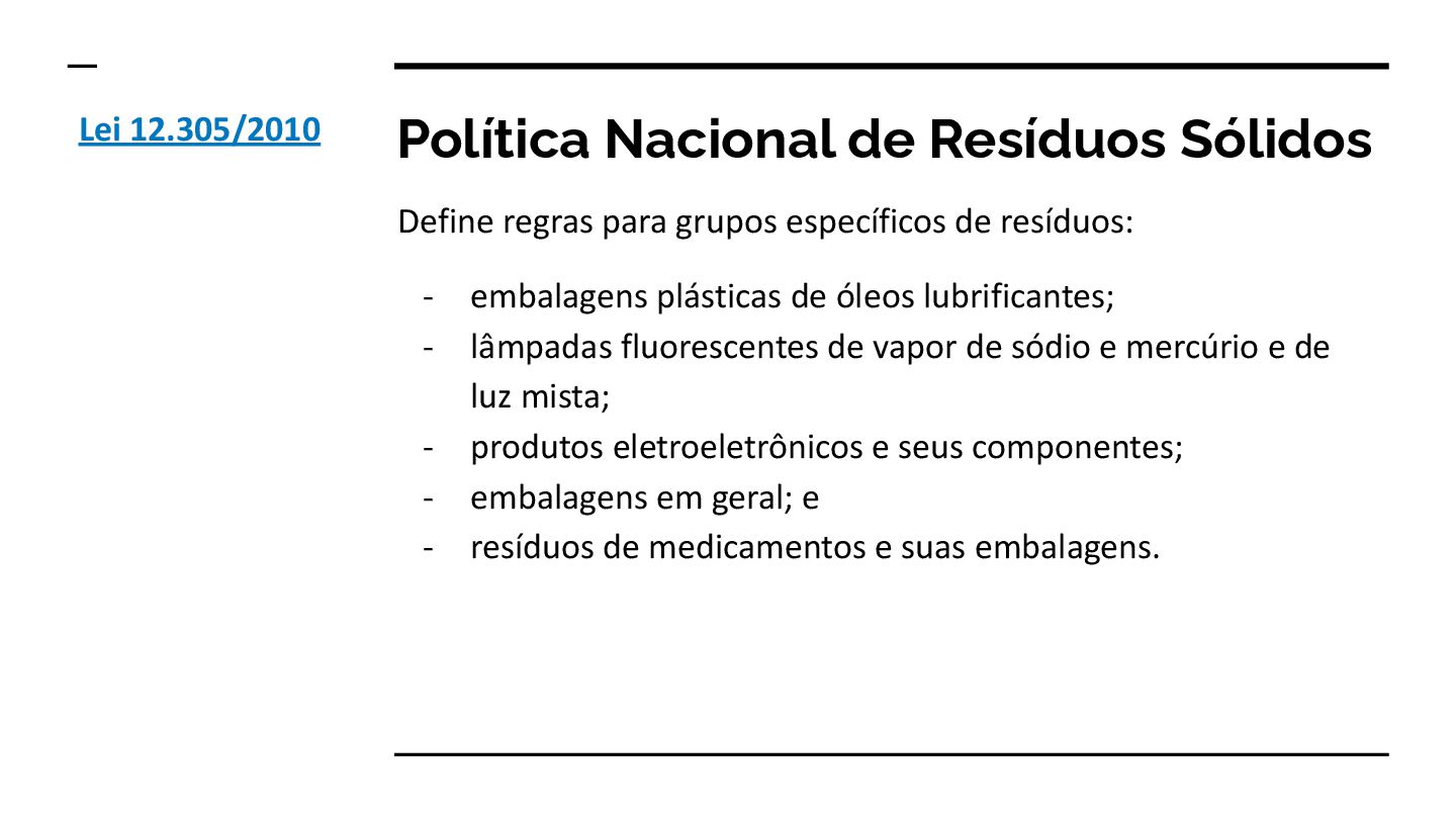 de resíduos: - embalagens plásticas de óleos lubrificantes; - lâmpadas fluorescentes de vapor de sódio e mercúrio e de luz mista; - produtos eletroeletrônicos e seus componentes; - embalagens em geral; e - resíduos de medicamentos e suas embalagens. Lei 12.305/2010