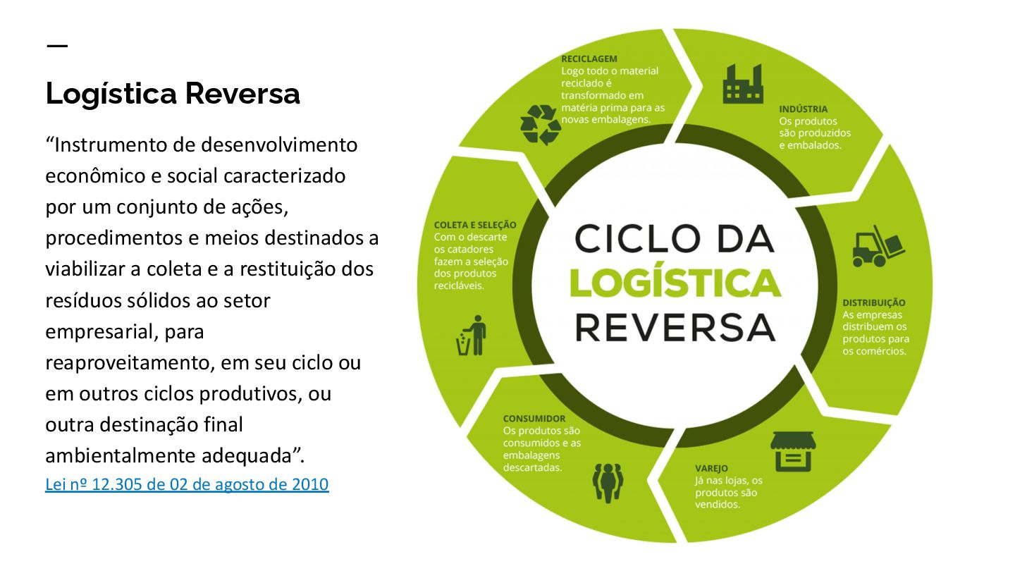 um conjunto de ações, procedimentos e meios destinados a viabilizar a coleta e a restituição dos resíduos sólidos ao setor empresarial, para reaproveitamento, em seu ciclo ou em outros ciclos produtivos, ou outra destinação final ambientalmente adequada”. Lei nº 12.305 de 02 de agosto de 2010