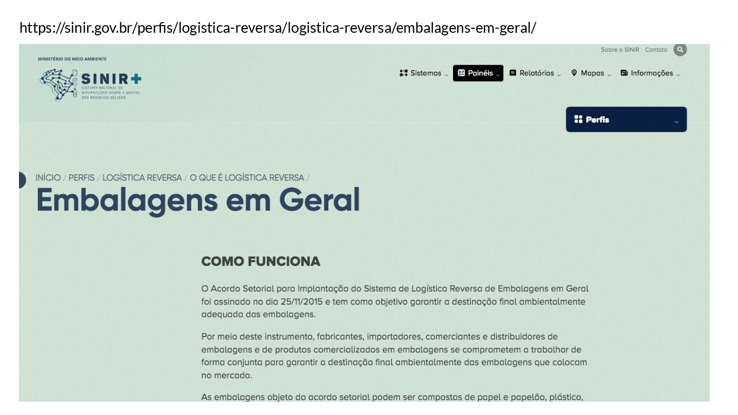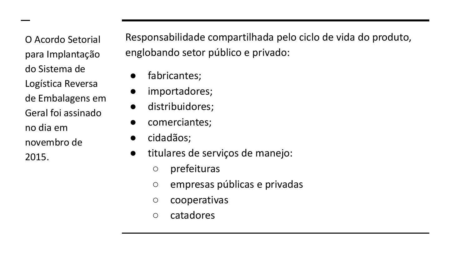 público e privado: • fabricantes; • importadores; • distribuidores; • comerciantes; • cidadãos; • titulares de serviços de manejo: ◦ prefeituras ◦ empresas públicas e privadas ◦ cooperativas ◦ catadores O Acordo Setorial para Implantação do Sistema de Logística Reversa de Embalagens em Geral foi assinado no dia em novembro de 2015.