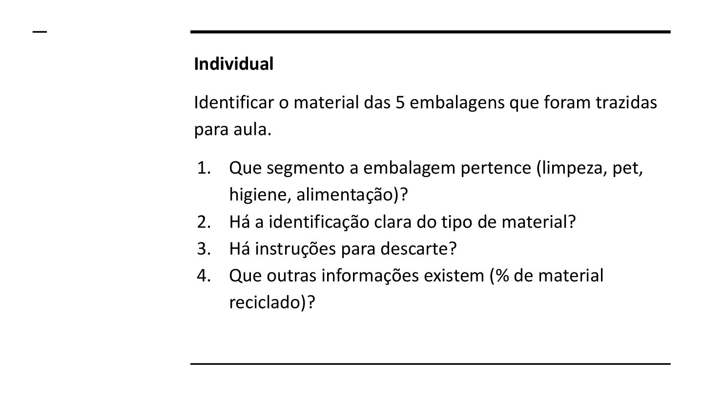 para aula. 1. Que segmento a embalagem pertence (limpeza, pet, higiene, alimentação)? 2. Há a identificação clara do tipo de material? 3. Há instruções para descarte? 4. Que outras informações existem (% de material reciclado)?