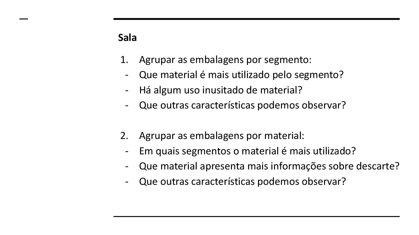 é mais utilizado pelo segmento? - Há algum uso inusitado de material? - Que outras características podemos observar? 2. Agrupar as embalagens por material: - Em quais segmentos o material é mais utilizado? - Que material apresenta mais informações sobre descarte? - Que outras características podemos observar?