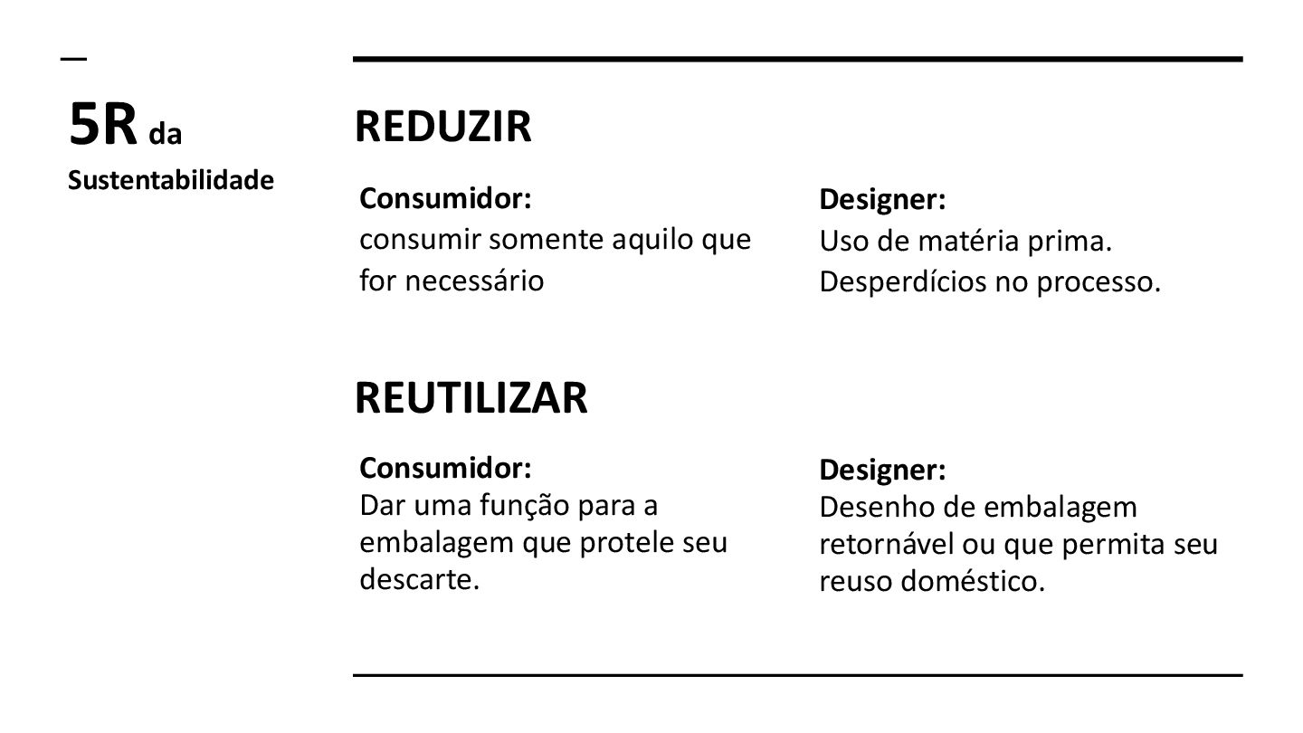 de matéria prima. Desperdícios no processo. 5R da Sustentabilidade REUTILIZAR Consumidor: Dar uma função para a embalagem que protele seu descarte. Designer: Desenho de embalagem retornável ou que permita seu reuso doméstico.