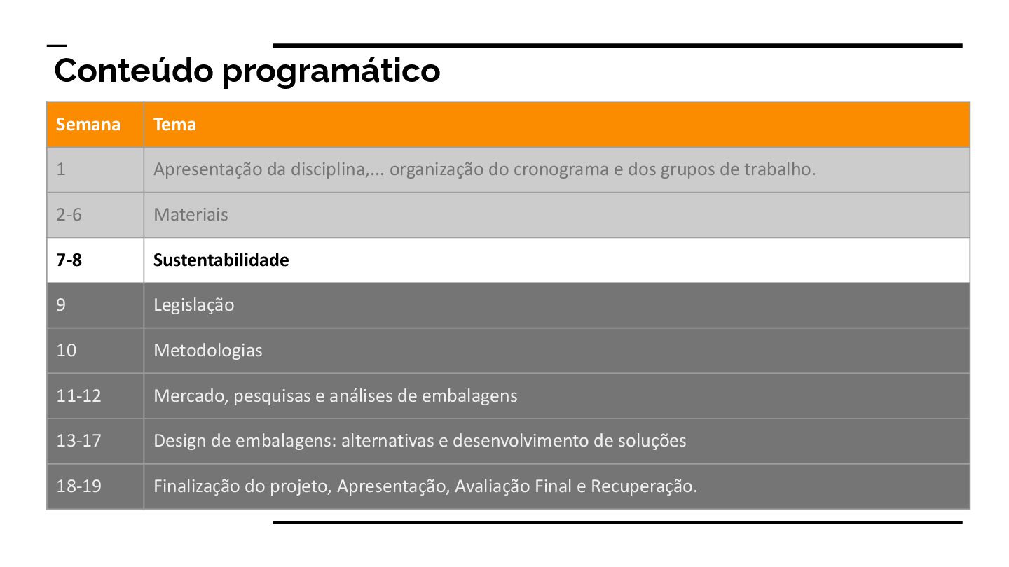 cronograma e dos grupos de trabalho. 2-6 Materiais 7-8 Sustentabilidade 9 Legislação 10 Metodologias 11-12 Mercado, pesquisas e análises de embalagens 13-17 Design de embalagens: alternativas e desenvolvimento de soluções 18-19 Finalização do projeto, Apresentação, Avaliação Final e Recuperação.