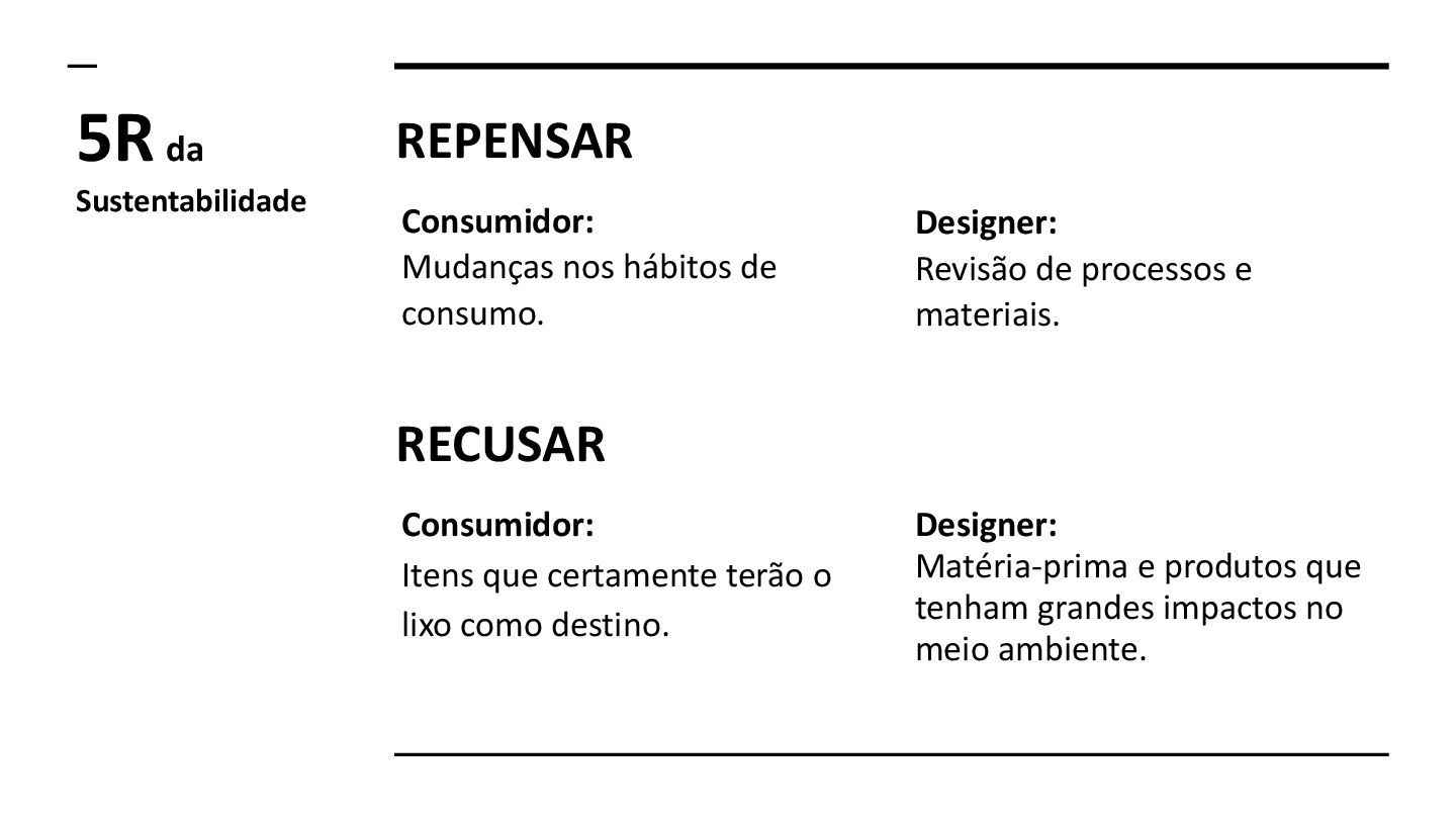 processos e materiais. 5R da Sustentabilidade RECUSAR Consumidor: Itens que certamente terão o lixo como destino. Designer: Matéria-prima e produtos que tenham grandes impactos no meio ambiente.