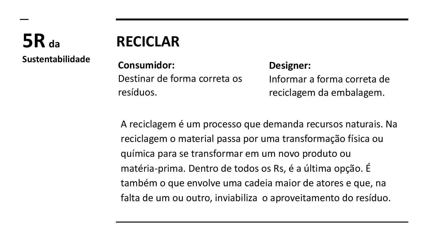 a forma correta de reciclagem da embalagem. 5R da Sustentabilidade A reciclagem é um processo que demanda recursos naturais. Na reciclagem o material passa por uma transformação física ou química para se transformar em um novo produto ou matéria-prima. Dentro de todos os Rs, é a última opção. É também o que envolve uma cadeia maior de atores e que, na falta de um ou outro, inviabiliza o aproveitamento do resíduo.