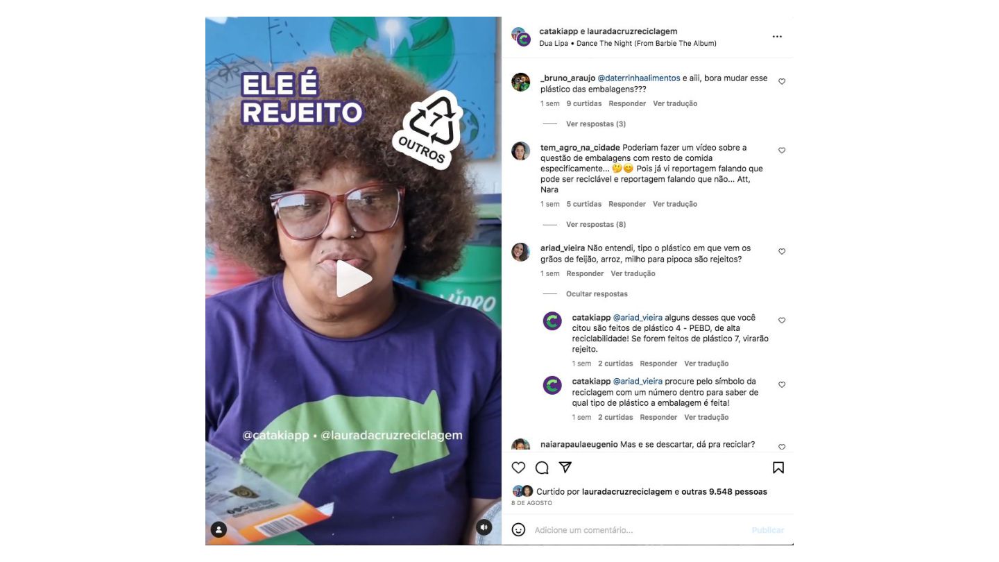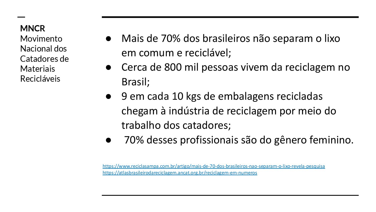 em comum e reciclável; • Cerca de 800 mil pessoas vivem da reciclagem no Brasil; • 9 em cada 10 kgs de embalagens recicladas chegam à indústria de reciclagem por meio do trabalho dos catadores; • 70% desses profissionais são do gênero feminino. https://www.reciclasampa.com.br/artigo/mais-de-70-dos-brasileiros-nao-separam-o-lixo-revela-pesquisa https://atlasbrasileirodareciclagem.ancat.org.br/reciclagem-em-numeros MNCR Movimento Nacional dos Catadores de Materiais Recicláveis