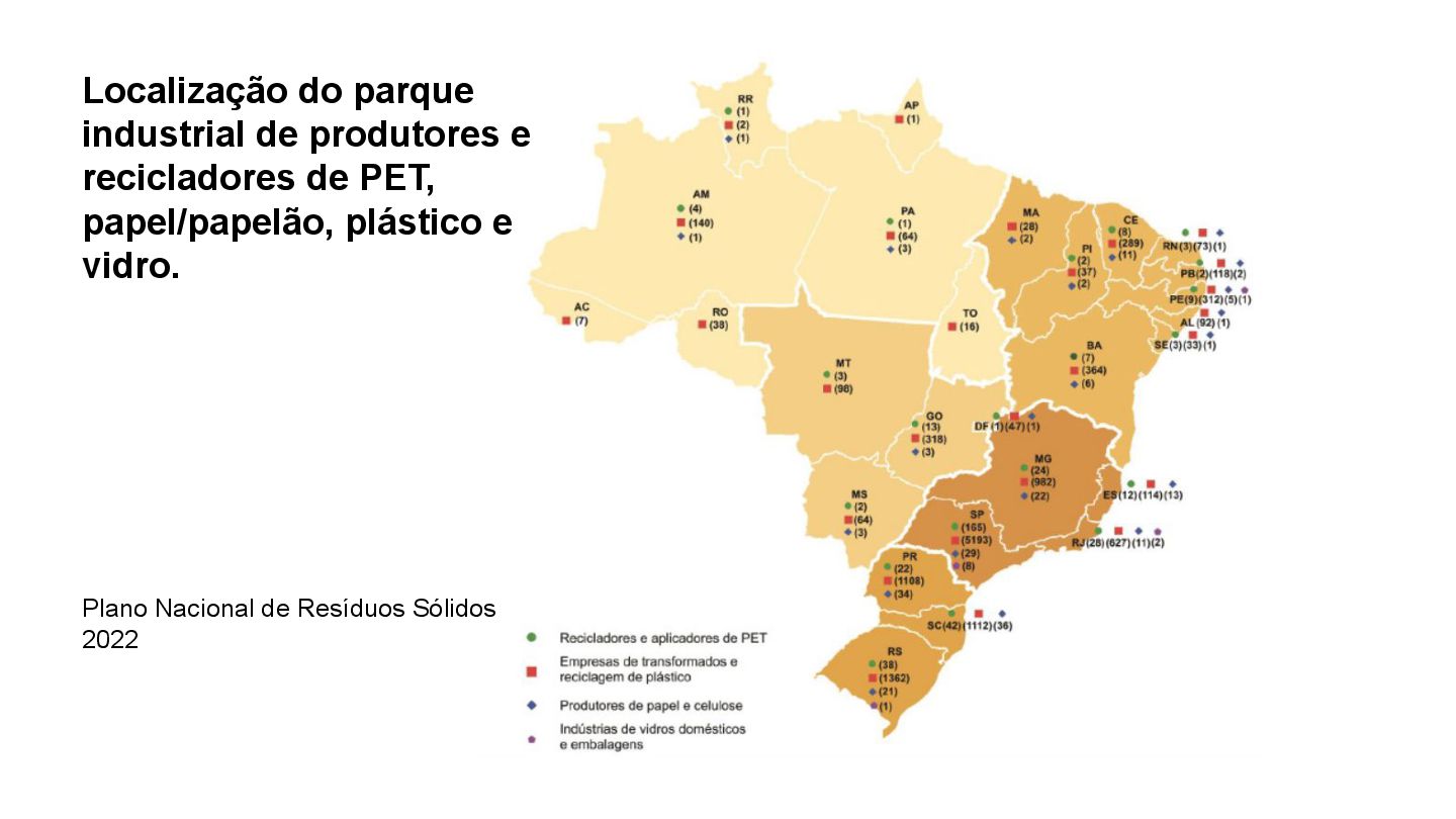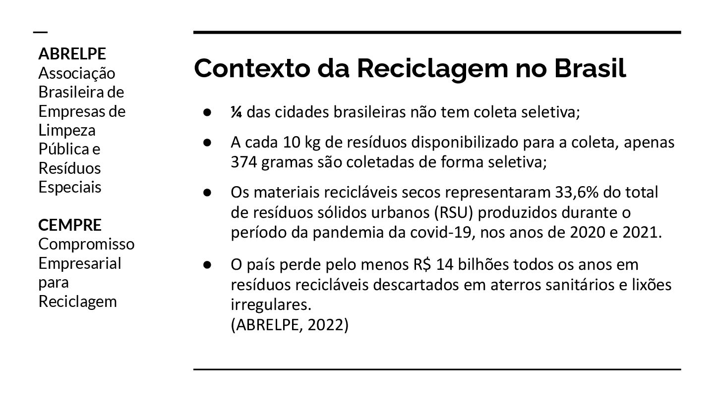 não tem coleta seletiva; • A cada 10 kg de resíduos disponibilizado para a coleta, apenas 374 gramas são coletadas de forma seletiva; • Os materiais recicláveis secos representaram 33,6% do total de resíduos sólidos urbanos (RSU) produzidos durante o período da pandemia da covid-19, nos anos de 2020 e 2021. • O país perde pelo menos R$ 14 bilhões todos os anos em resíduos recicláveis descartados em aterros sanitários e lixões irregulares. (ABRELPE, 2022) ABRELPE Associação Brasileira de Empresas de Limpeza Pública e Resíduos Especiais CEMPRE Compromisso Empresarial para Reciclagem