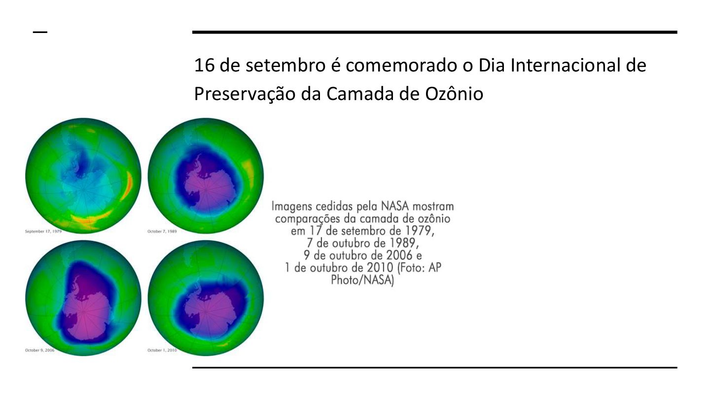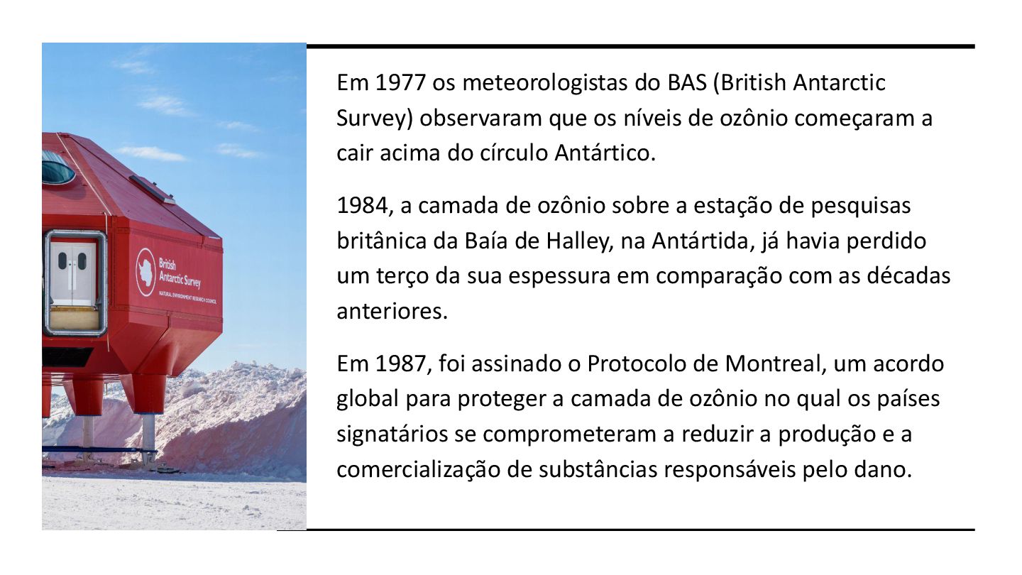 que os níveis de ozônio começaram a cair acima do círculo Antártico. 1984, a camada de ozônio sobre a estação de pesquisas britânica da Baía de Halley, na Antártida, já havia perdido um terço da sua espessura em comparação com as décadas anteriores. Em 1987, foi assinado o Protocolo de Montreal, um acordo global para proteger a camada de ozônio no qual os países signatários se comprometeram a reduzir a produção e a comercialização de substâncias responsáveis pelo dano.