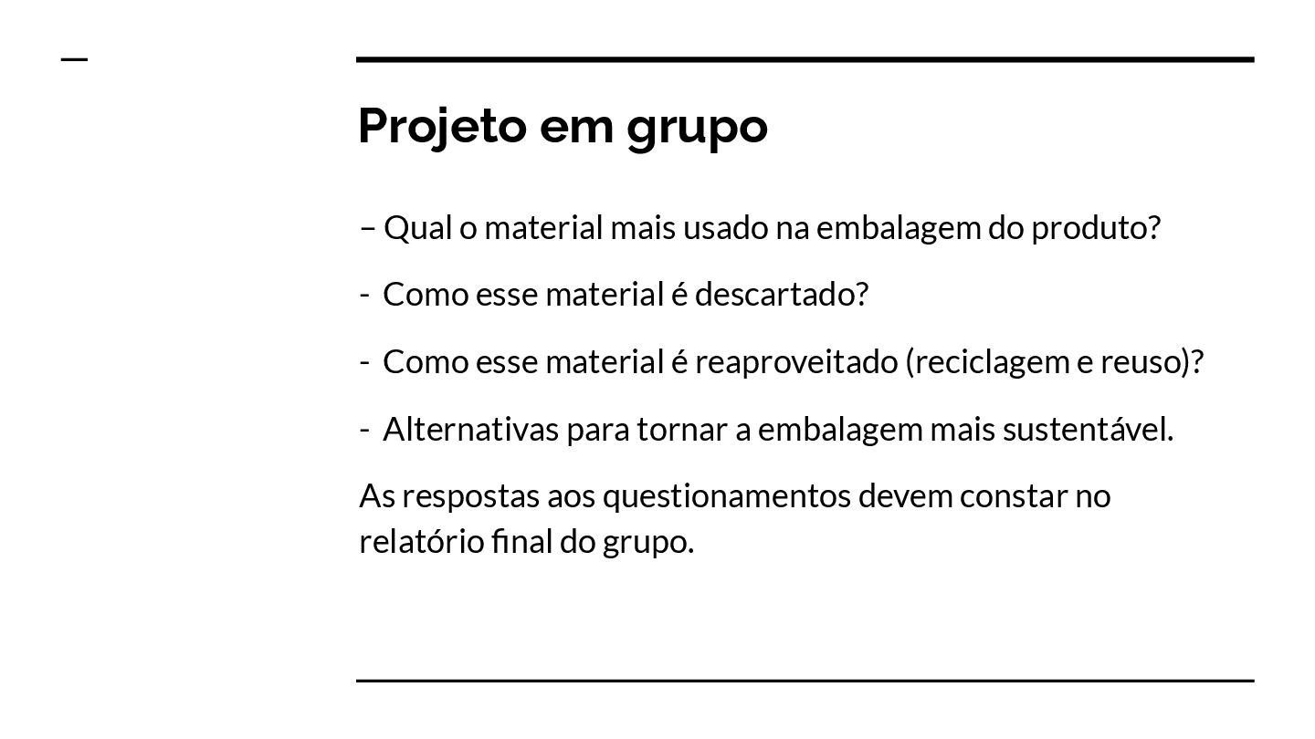 embalagem do produto? - Como esse material é descartado? - Como esse material é reaproveitado (reciclagem e reuso)? - Alternativas para tornar a embalagem mais sustentável. As respostas aos questionamentos devem constar no relatório final do grupo.