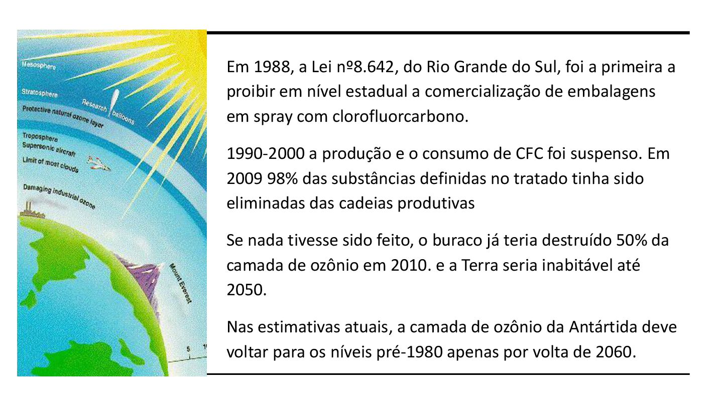 foi a primeira a proibir em nível estadual a comercialização de embalagens em spray com clorofluorcarbono. 1990-2000 a produção e o consumo de CFC foi suspenso. Em 2009 98% das substâncias definidas no tratado tinha sido eliminadas das cadeias produtivas Se nada tivesse sido feito, o buraco já teria destruído 50% da camada de ozônio em 2010. e a Terra seria inabitável até 2050. Nas estimativas atuais, a camada de ozônio da Antártida deve voltar para os níveis pré-1980 apenas por volta de 2060.