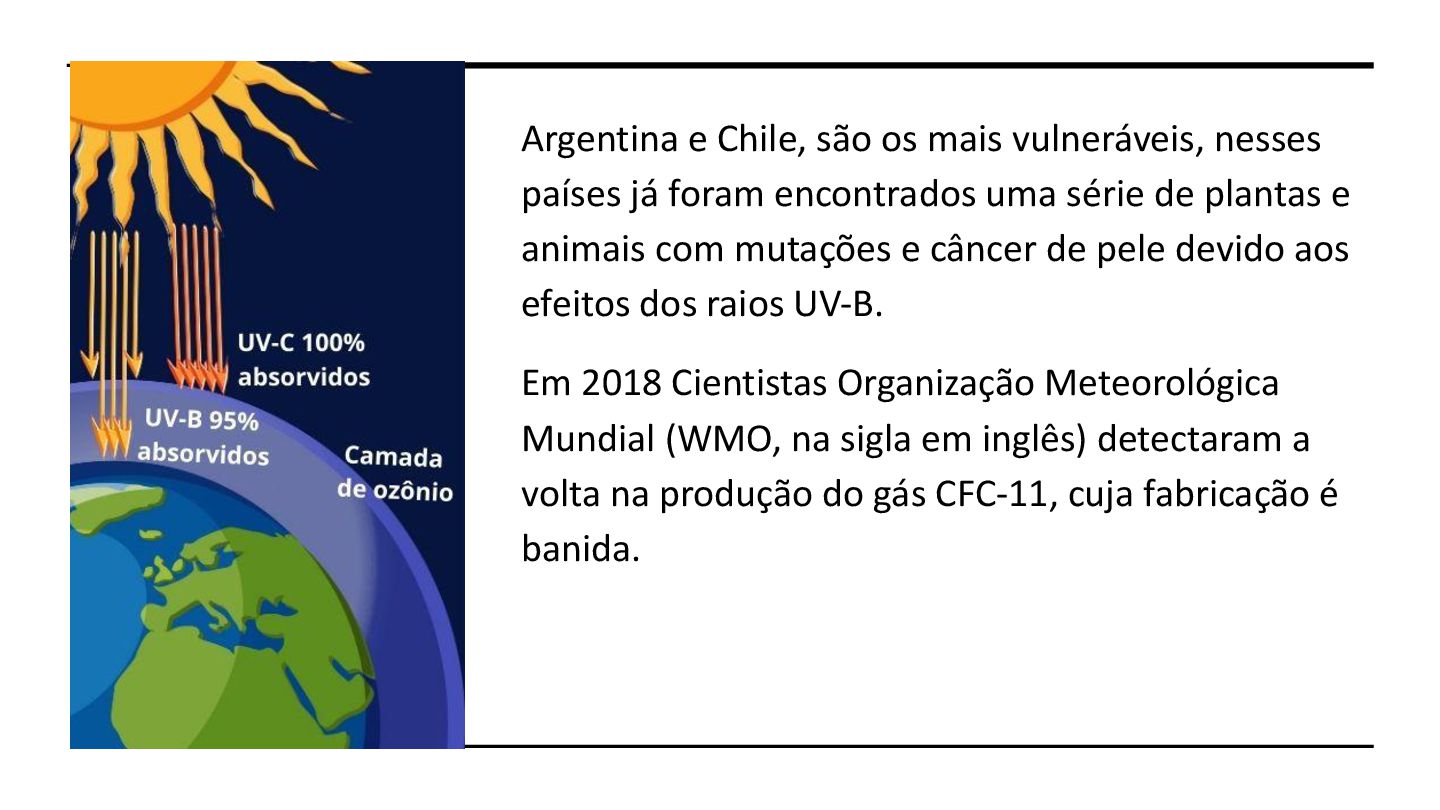 foram encontrados uma série de plantas e animais com mutações e câncer de pele devido aos efeitos dos raios UV-B. Em 2018 Cientistas Organização Meteorológica Mundial (WMO, na sigla em inglês) detectaram a volta na produção do gás CFC-11, cuja fabricação é banida.