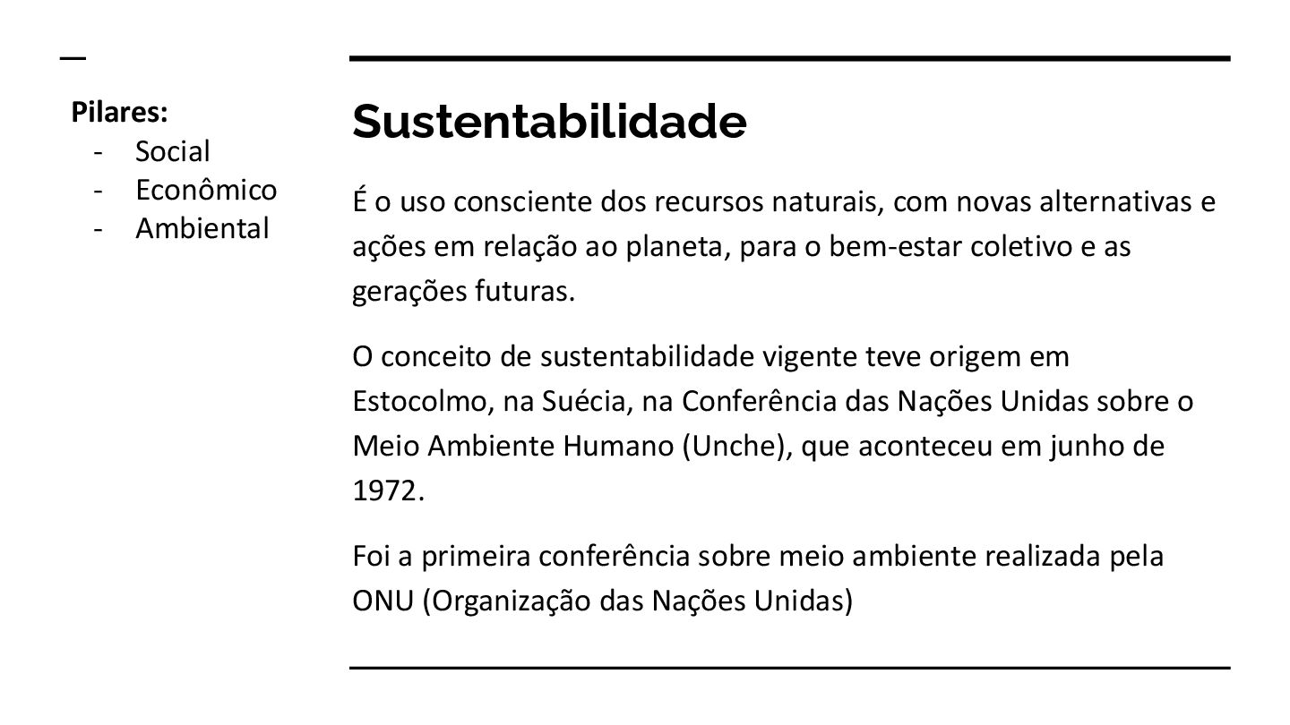 alternativas e ações em relação ao planeta, para o bem-estar coletivo e as gerações futuras. O conceito de sustentabilidade vigente teve origem em Estocolmo, na Suécia, na Conferência das Nações Unidas sobre o Meio Ambiente Humano (Unche), que aconteceu em junho de 1972. Foi a primeira conferência sobre meio ambiente realizada pela ONU (Organização das Nações Unidas) Pilares: - Social - Econômico - Ambiental