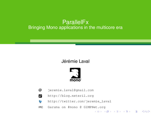 multicore computer are now part of our everyday life. Most desktop and laptop machines out there bundle a dual-core processor, quad-core processor or even 8-core processor by default. This multiplication of the number of core on the same chip is destined to become the way for manufacturers to remain competitive. However, developers were a bit left out in this process, having written sequential programs for ages whereas they were now required to parallelize their program to make them efficient which isn't an easy step to take.\r\n\r\nThat's why we now see the apparition of framework designed to help programmers to take advantage of this new architecture of processor by hiding away the parallel difficulty under primitives that they are used to. ParallelFx is one of such framework for the Mono and .NET world. By providing several new parallel constructs and concurrent data structures, it allows Mono applications to enter painlessly in this new multicore era.