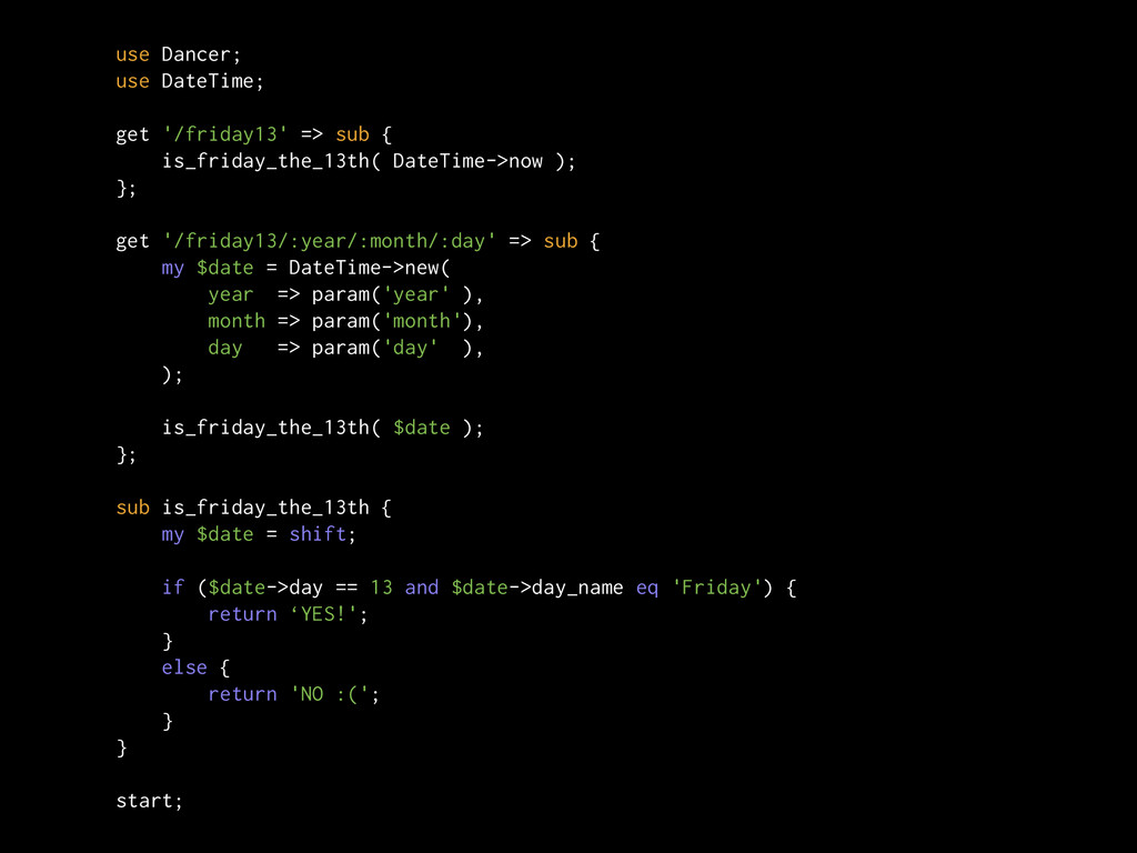 is_friday_the_13th( DateTime->now ); }; ! get '/friday13/:year/:month/:day' => sub { my $date = DateTime->new( year => param('year' ), month => param('month'), day => param('day' ), ); ! is_friday_the_13th( $date ); }; ! sub is_friday_the_13th { my $date = shift; ! if ($date->day == 13 and $date->day_name eq 'Friday') { return ‘YES!'; } else { return 'NO :('; } } ! start;