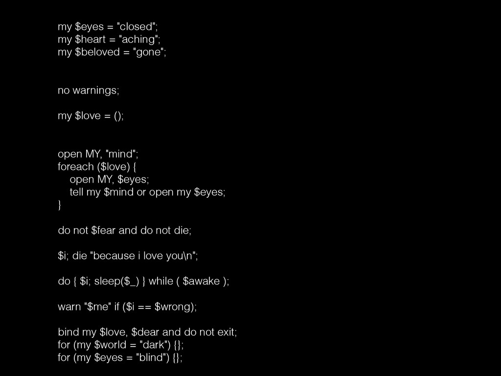 = "gone"; ! ! no warnings; ! my $love = (); ! ! open MY, "mind"; foreach ($love) { open MY, $eyes; tell my $mind or open my $eyes; } ! do not $fear and do not die; ! $i; die "because i love you\n"; ! do { $i; sleep($_) } while ( $awake ); ! warn "$me" if ($i == $wrong); ! bind my $love, $dear and do not exit; for (my $world = "dark") {}; for (my $eyes = "blind") {};