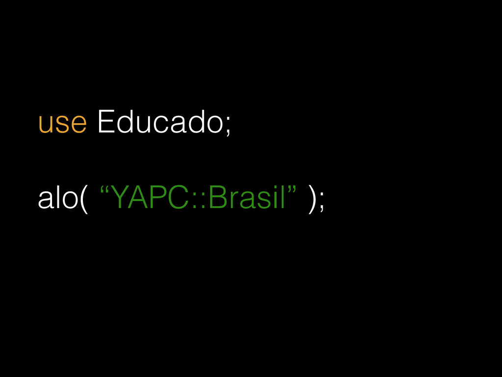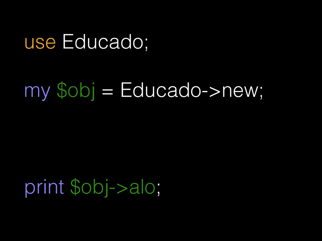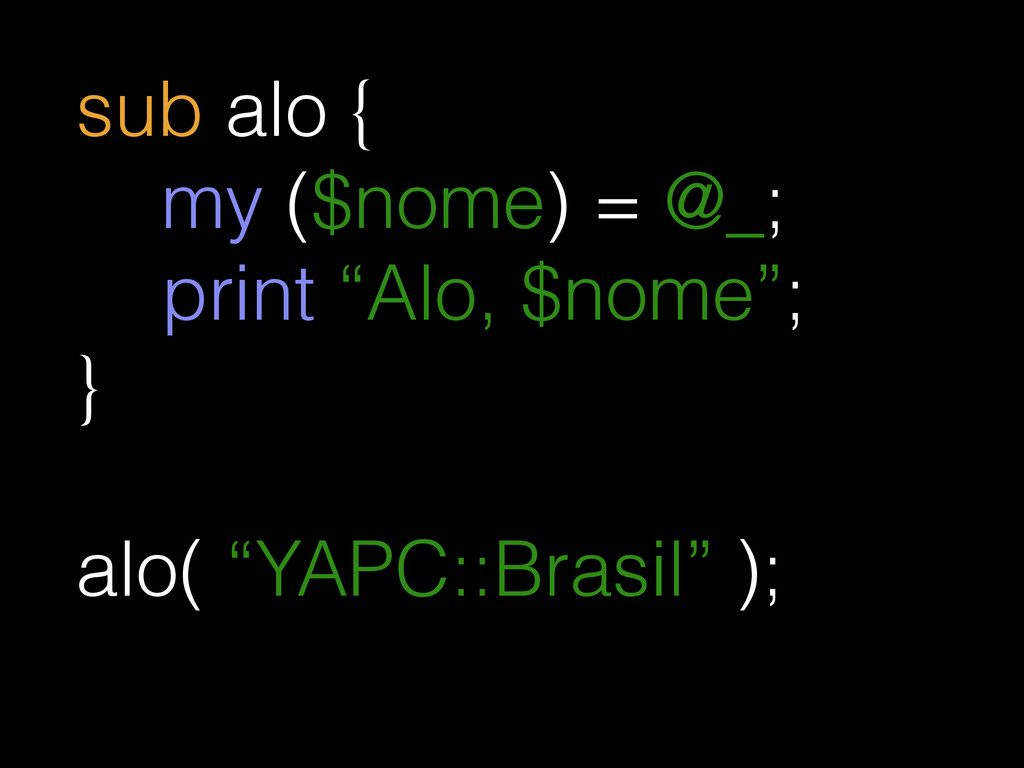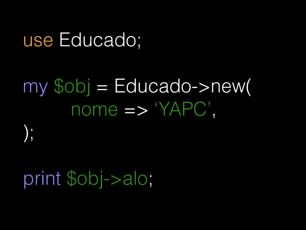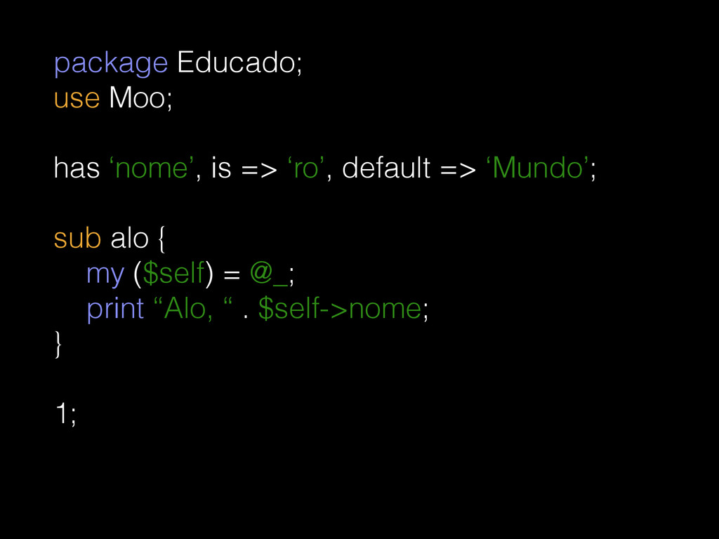 default => ‘Mundo’; ! sub alo { my ($self) = @_; print “Alo, “ . $self->nome; } ! 1;